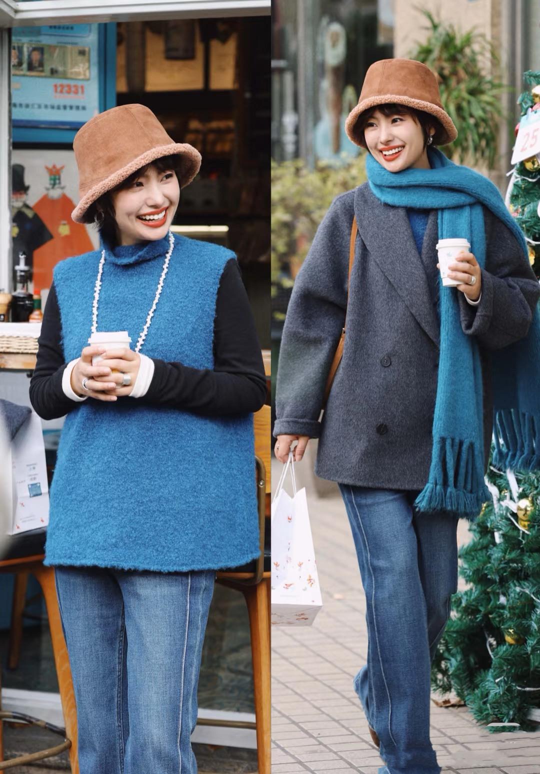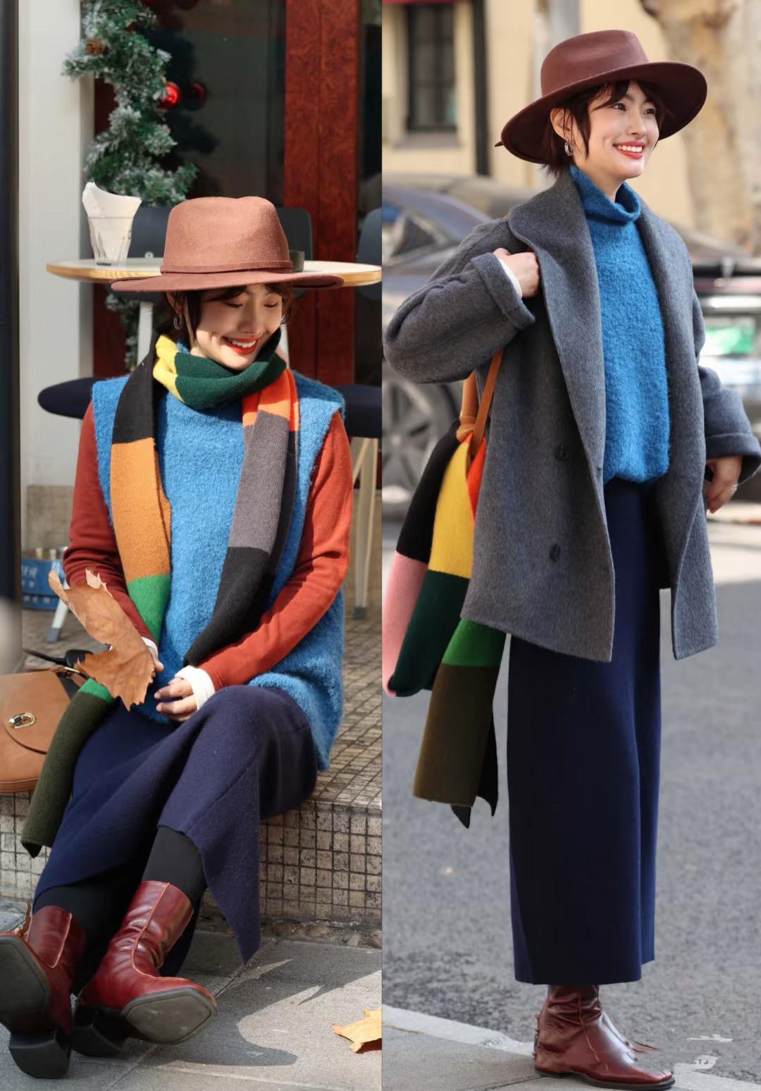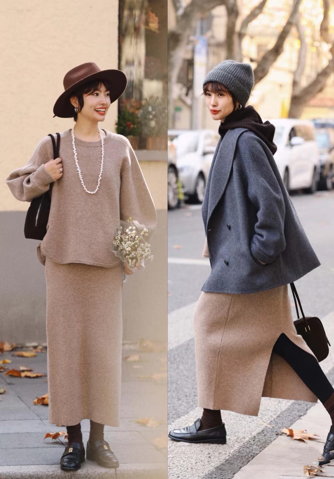 毛呢套裙長度過膝、優雅且穩重。用毛呢套裙配樂福鞋、小腿襪,也可以更洋氣保暖。毛呢半身裙、燕麥色系,帶着溫柔感很符合冬季氛圍。
