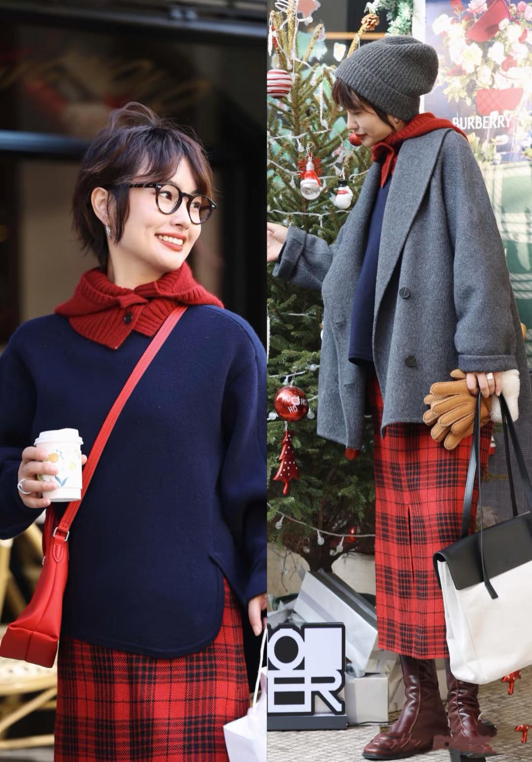 文藝復古風的穿搭,也可以如此活潑跳脫。紅黑格子半身裙、直筒款式更顯瘦,搭配短款毛呢大衣,層次清晰更有辨識度。
