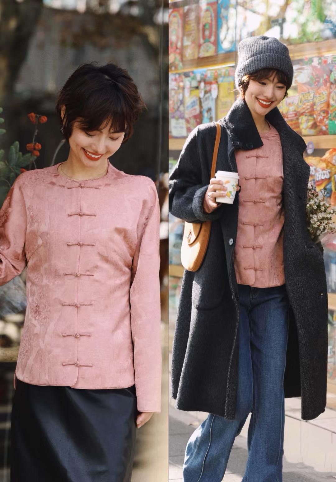 如果喜歡國風穿搭,也可以嘗試這種很顯氣質的組合。粉色國風上衣、暗啞提花+盤扣點綴,精緻又有女人味。