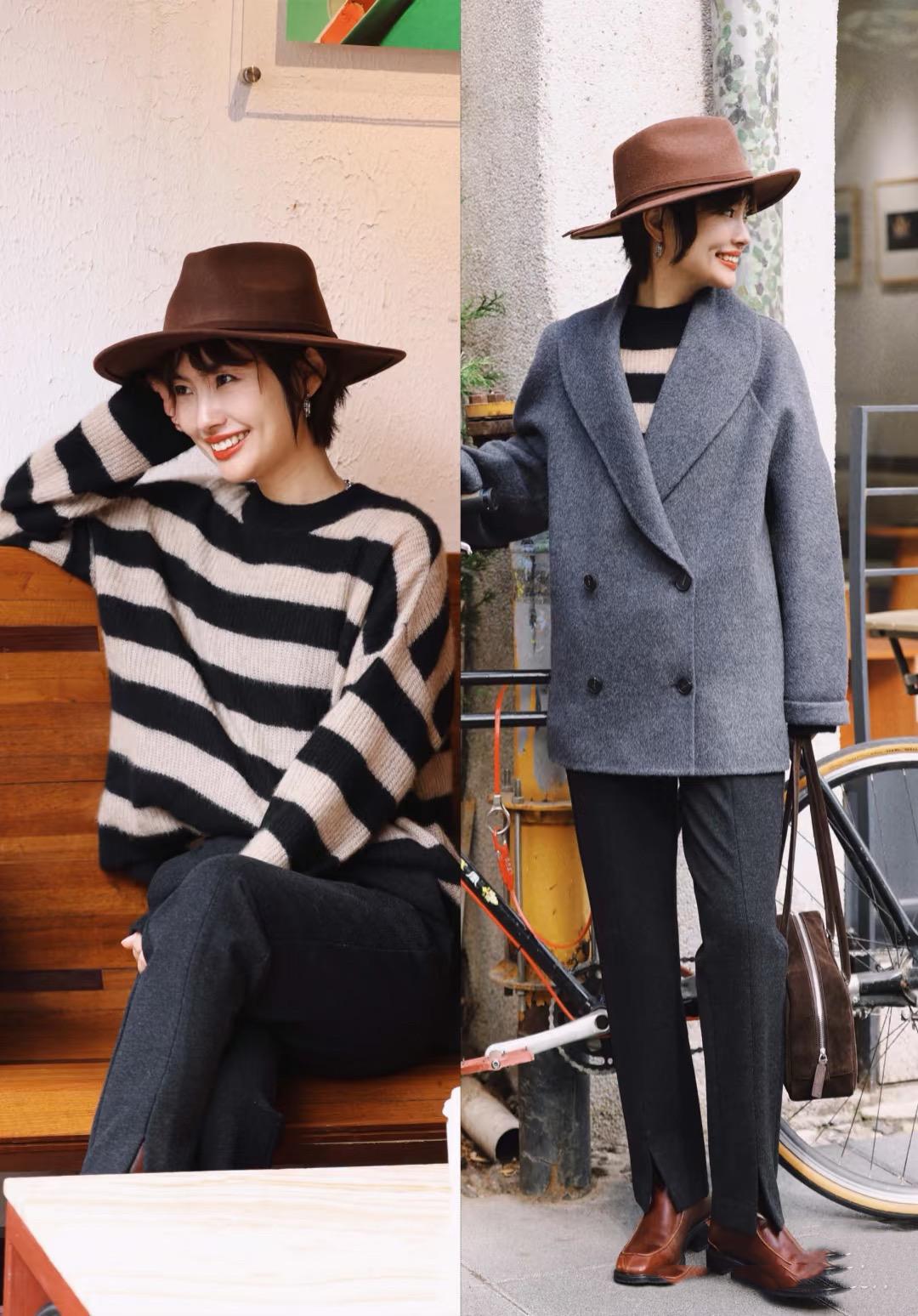 如果是豎領大衣,就推薦選擇低領的針織衫了。但這種翻領的大衣,確實與高領針織衫更配。
