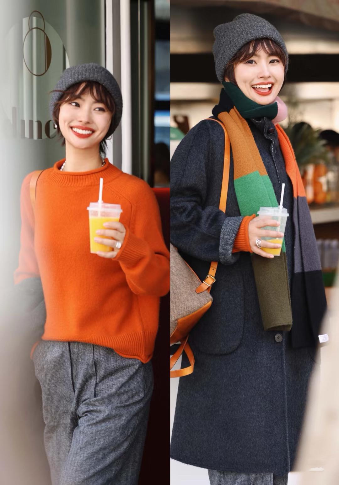 一組很溫暖、又特別高級的配色。南瓜色的針織衫,在冬天裏太有氛圍感,稍微寬鬆的版型舒適又溫暖。
