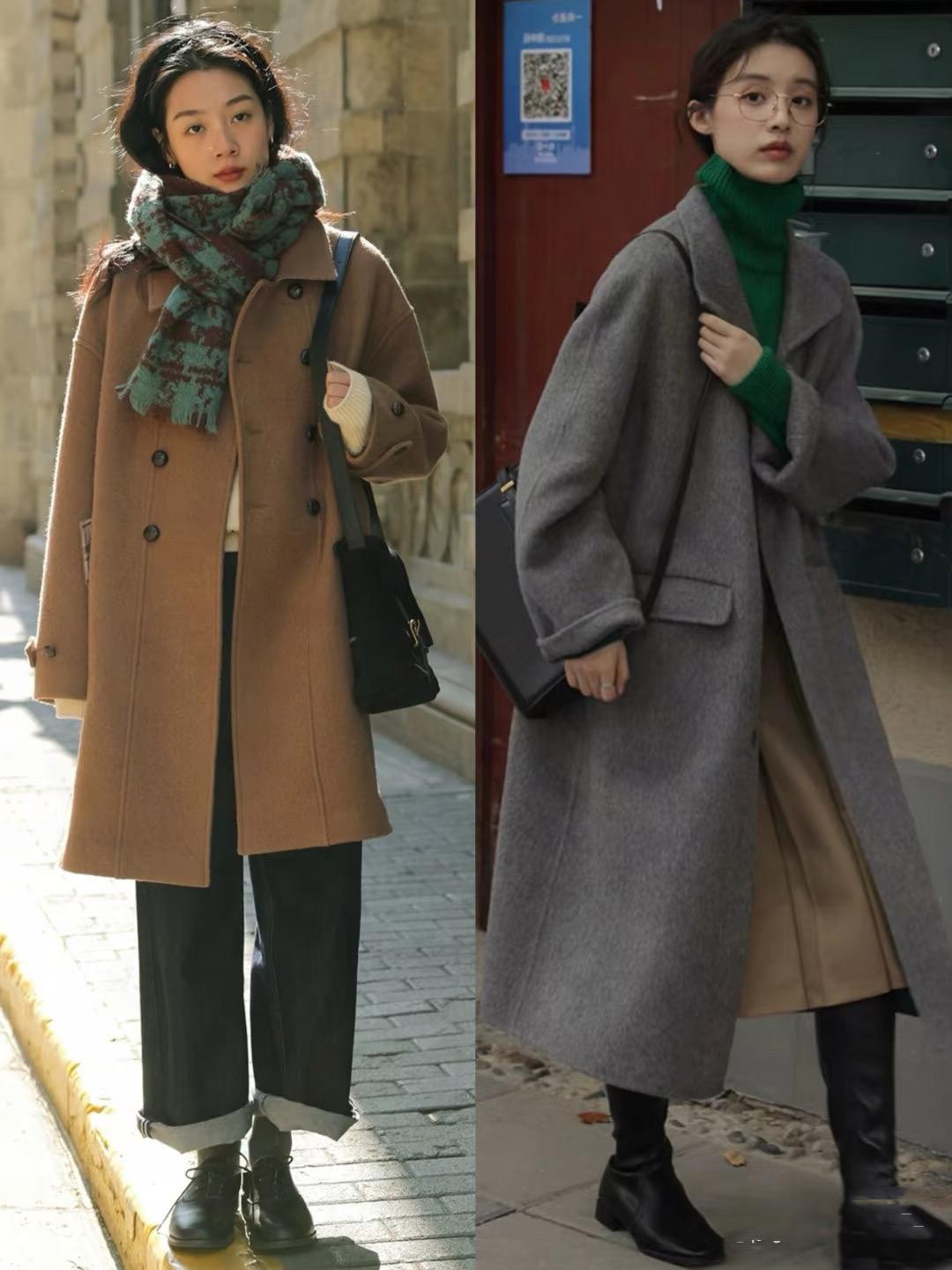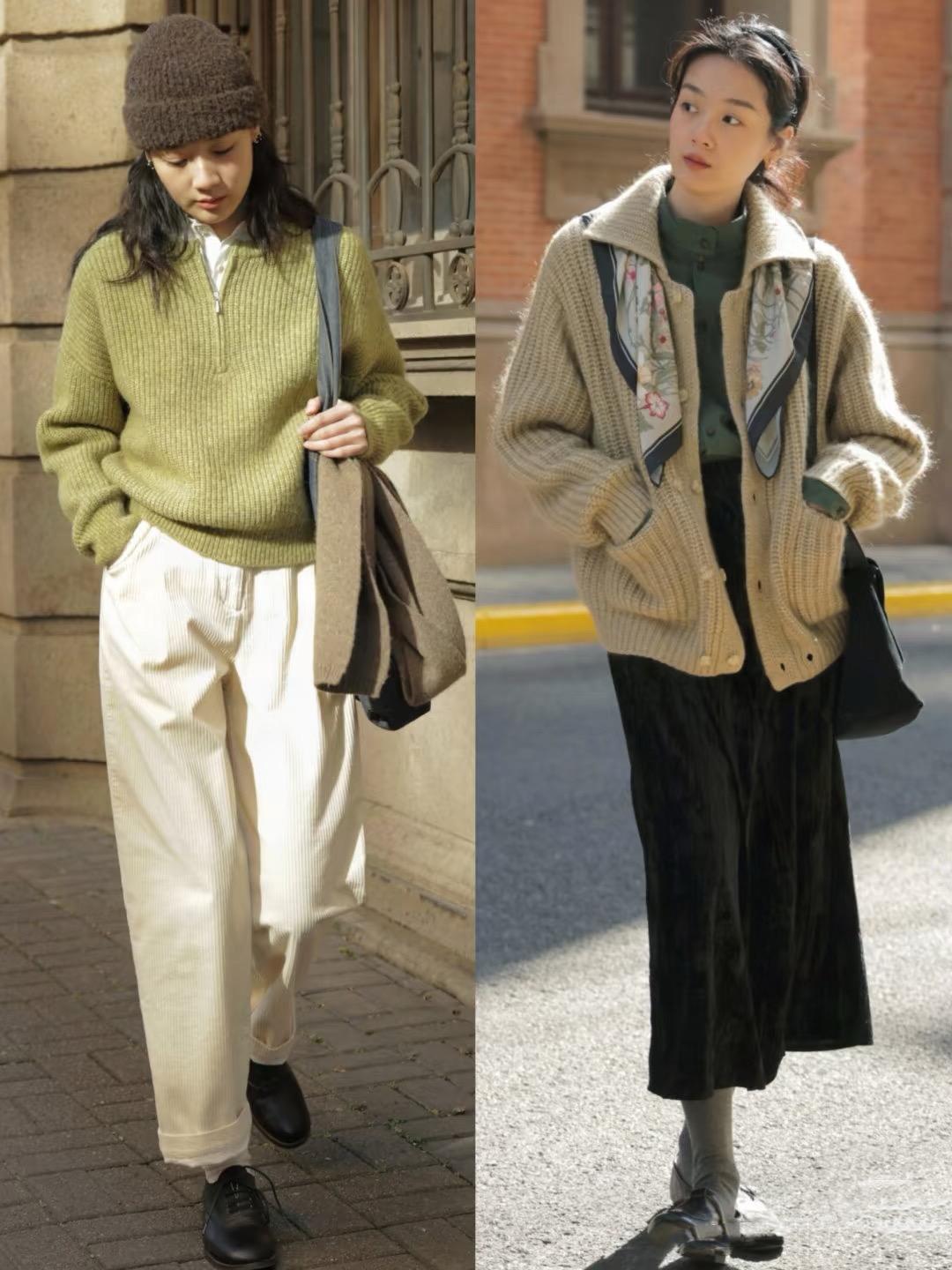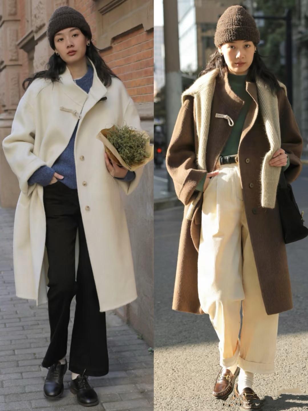 她們有一個共同點,就是比較懷舊,沉迷於那些年代感的穿搭。哪怕是一件毛呢大衣,也更偏愛復古風的細節,搭配牛角扣元素、帶上針織毛線帽,就呈現出文藝復古風的情懷。
