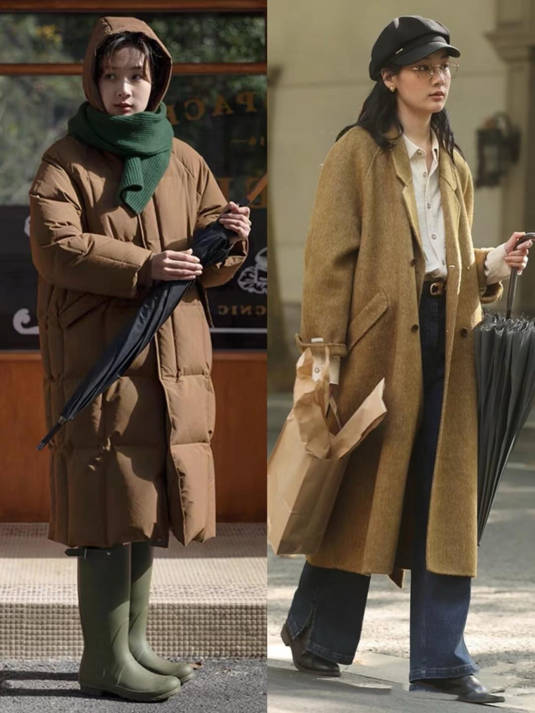 文藝復古風穿搭,自然需要兼顧穿搭中的保暖效果。像棉被一樣厚實的羽絨服,棕色系真的太溫暖了,既復古又大方。