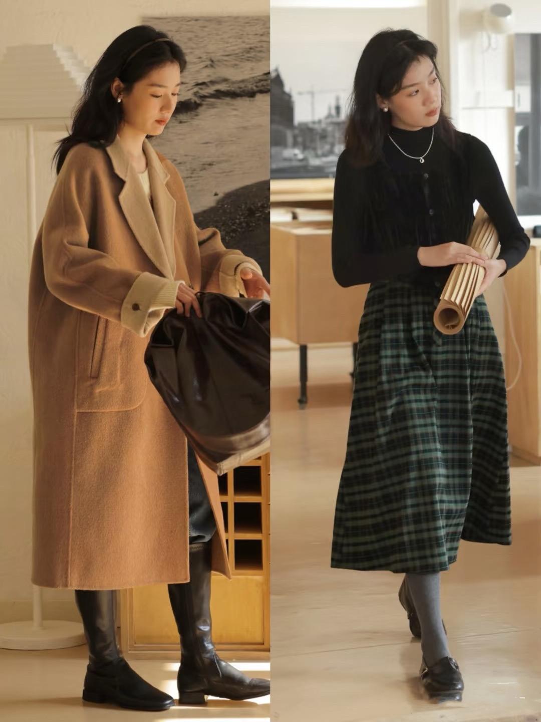 彷彿穿上特定年代的服裝,就可以感受到那一種氛圍。棕色的復古風毛呢大衣、翻駁領、斜插口的設計,慵懶大氣。復古風的格子半身裙,寬鬆版型、慵懶還遮肉。