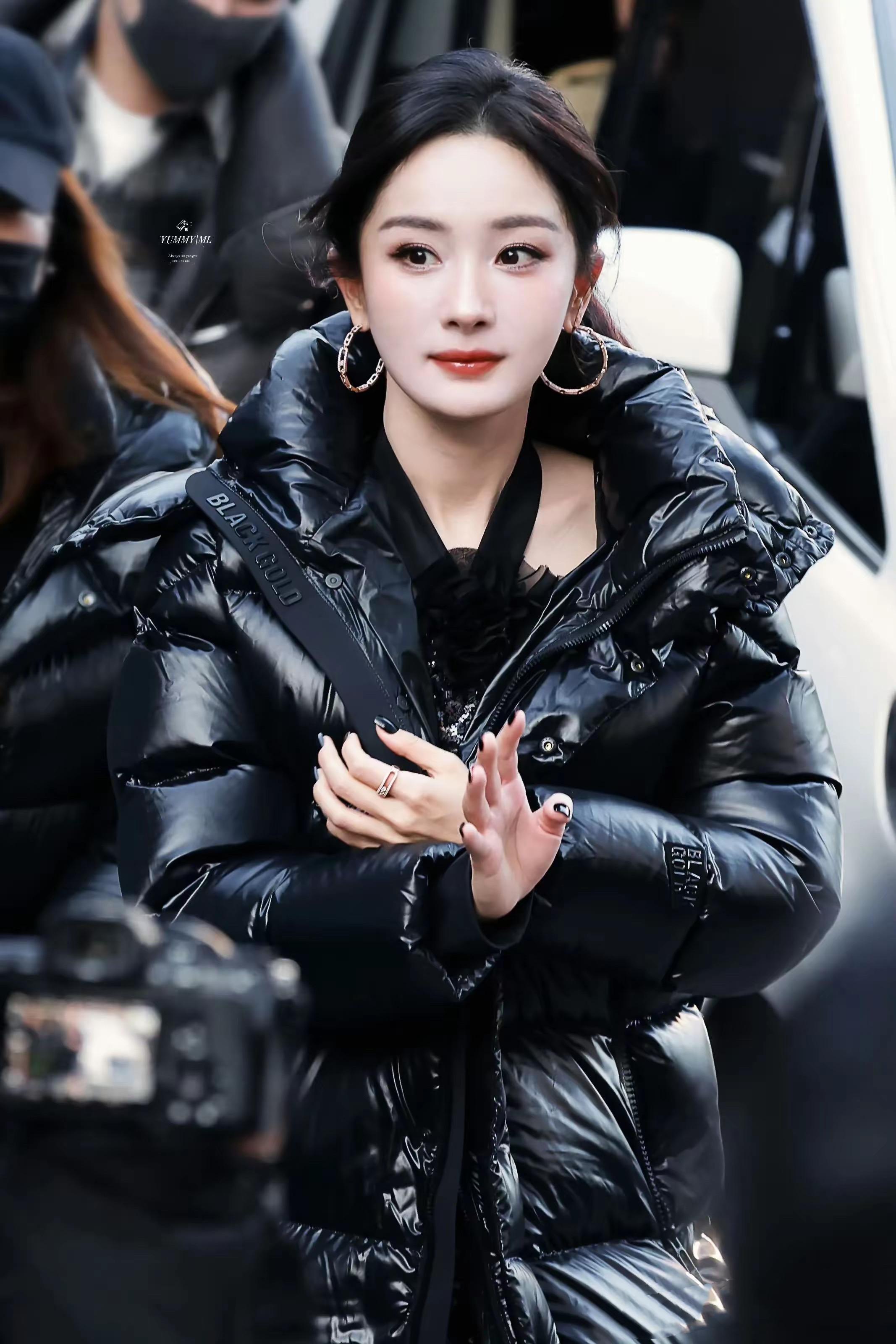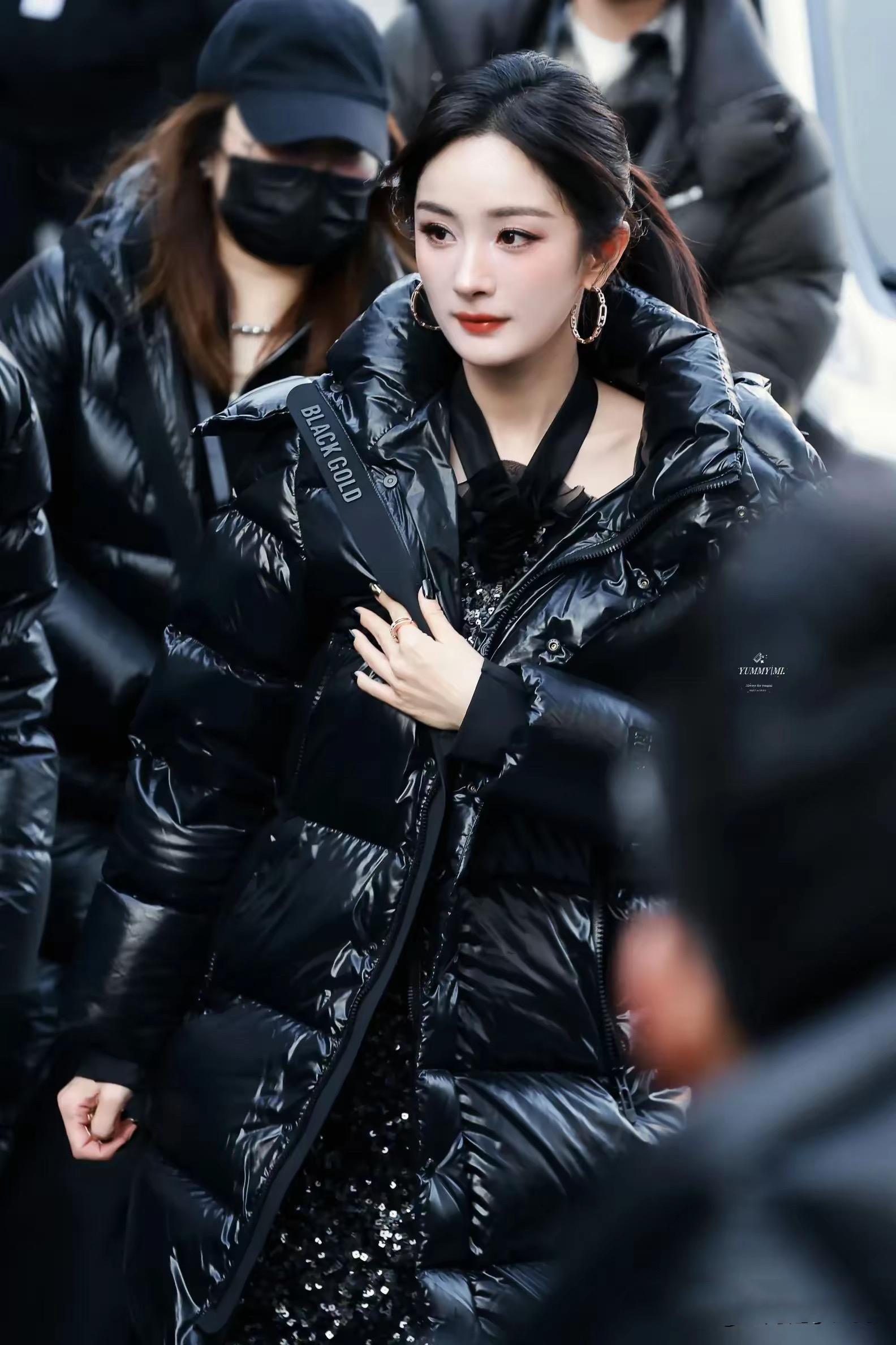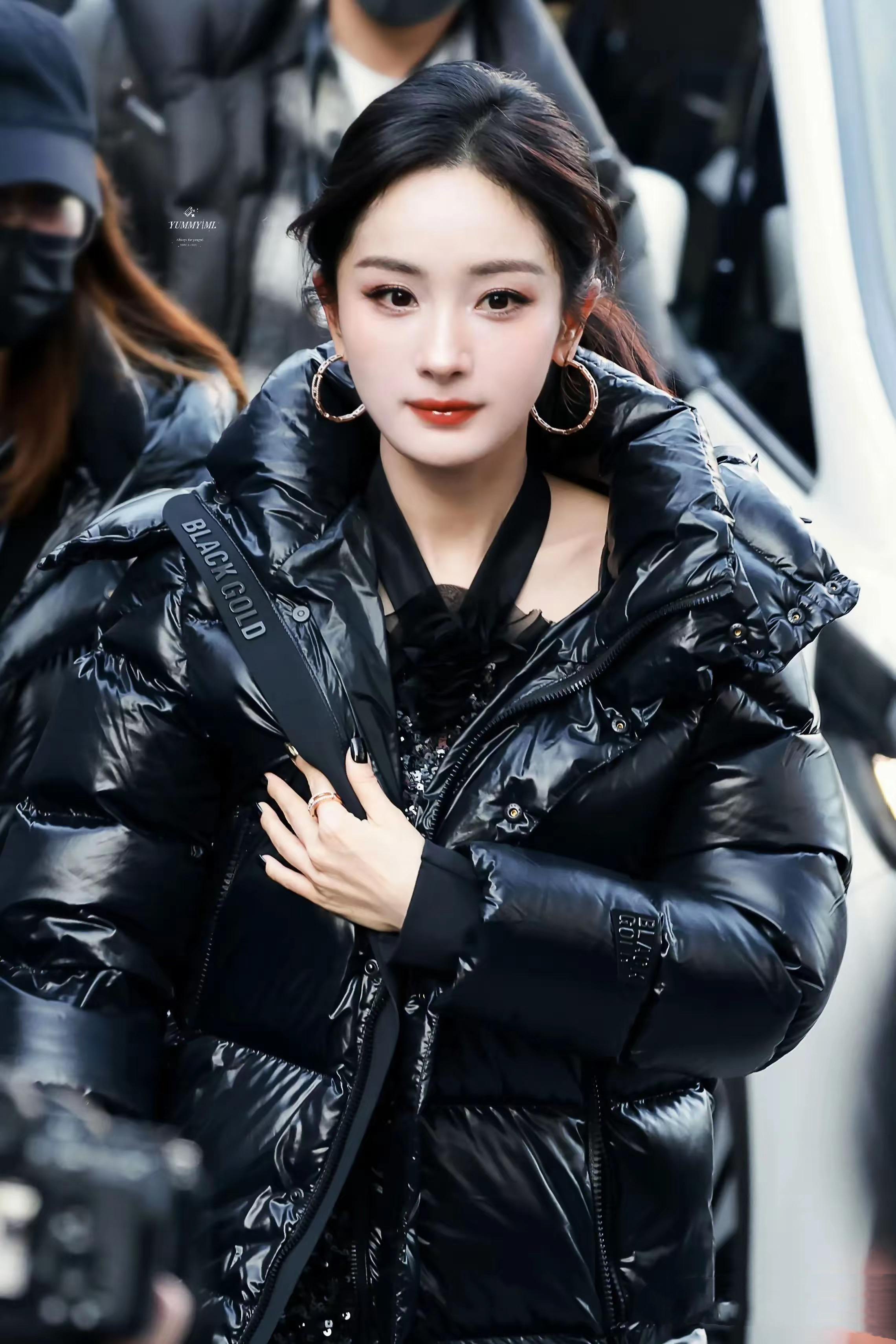黑金羽絨服,還能穿得這麼美。楊冪紮起高馬尾、帶上大圓環的耳環,那麼醒目,又那麼顯貴。