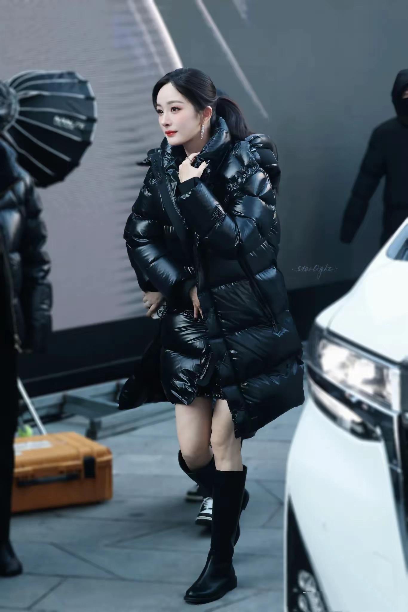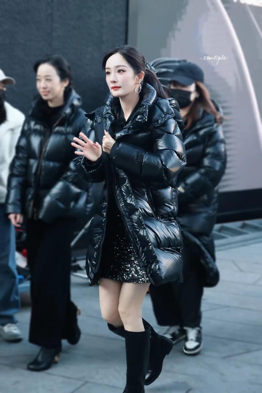 在零度的北京,楊冪光腿穿黑金羽絨服,她真的是太拼了。
