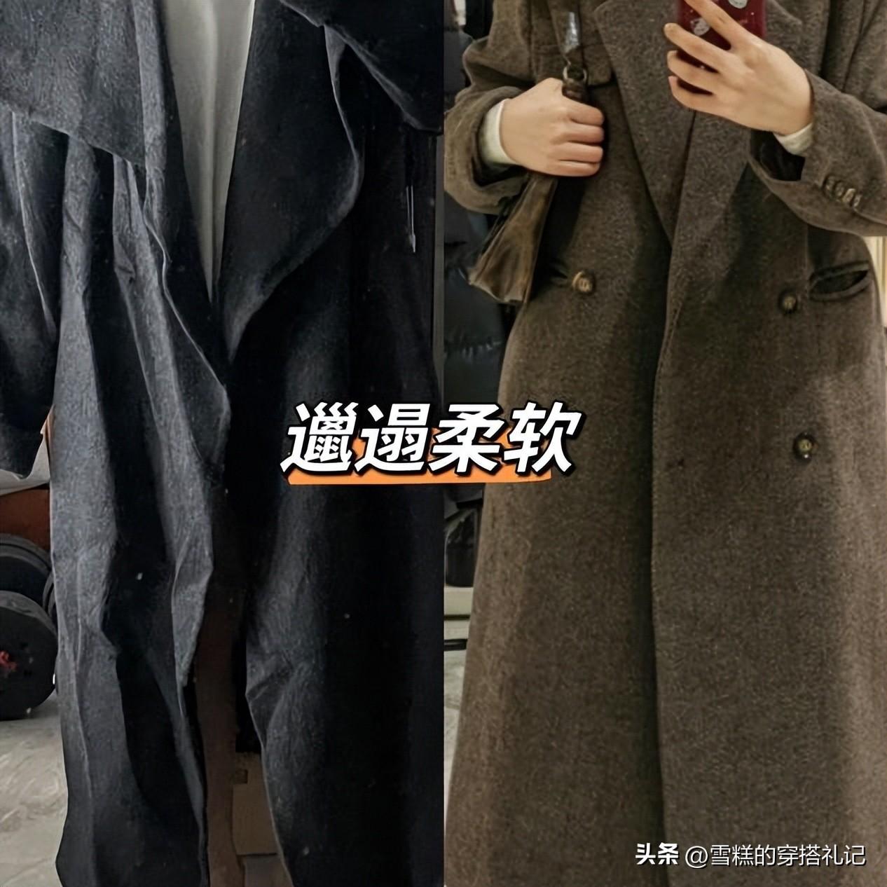 不建議大家選擇化纖材質的大衣,這種面料本身就偏硬一些,穿起來緊繃感很強,不夠舒適。質感好的大衣不僅更加輕薄保暖,還有很強的光澤感以及挺括的版型,能夠更好的修飾身材,而且穿起來不容易變形起皺。這類面料主要是高純度的天然動物纖維,比如駝絨、羊絨等等,還帶有很強的水波紋和珠光,摸起來柔軟絲滑,有一定的彈性,穿起來更加高級!