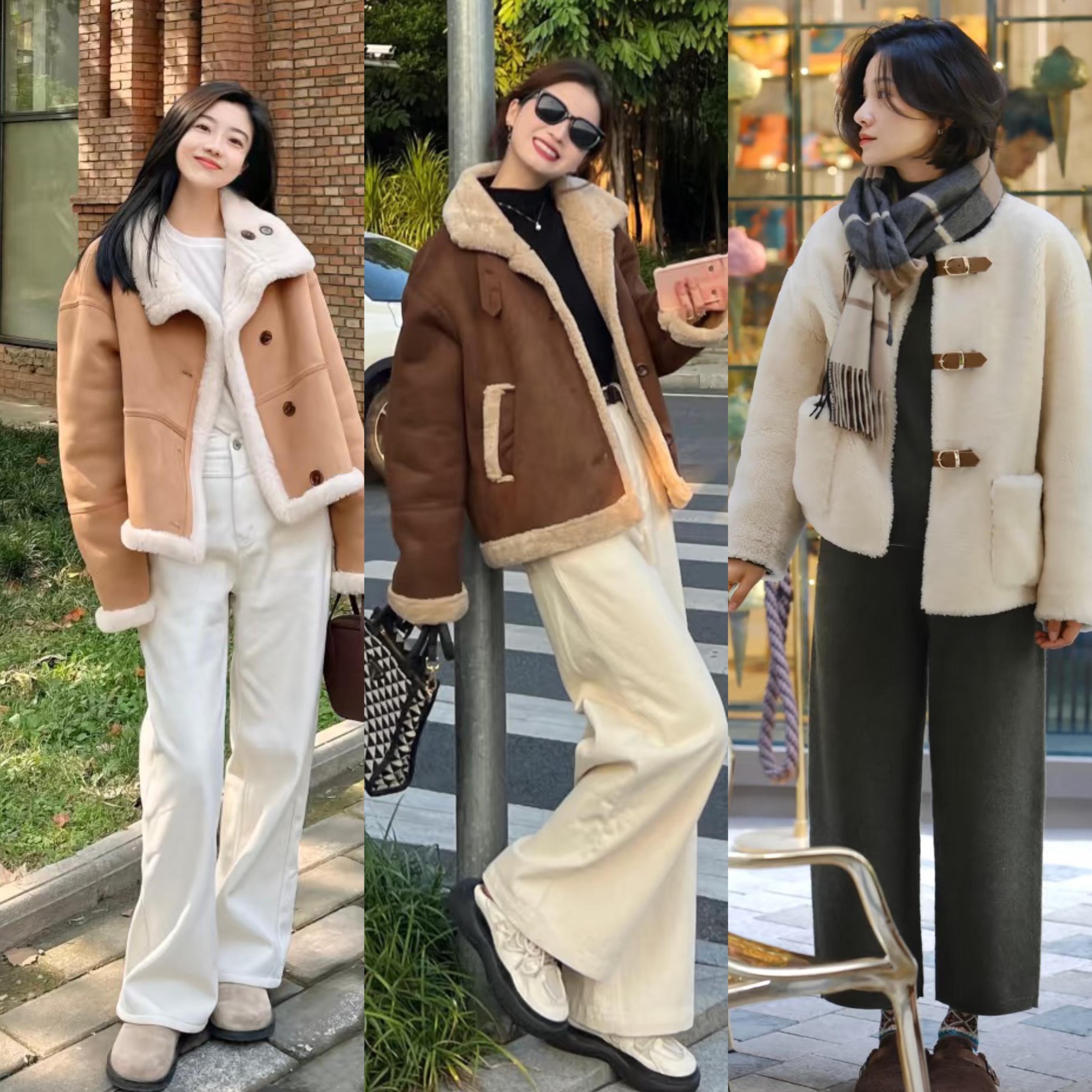 翻領的皮毛一體外套,也可以配修身的打底衫、針織衫來穿,這種及腰款的長度不會顯的邋遢、壓個子。