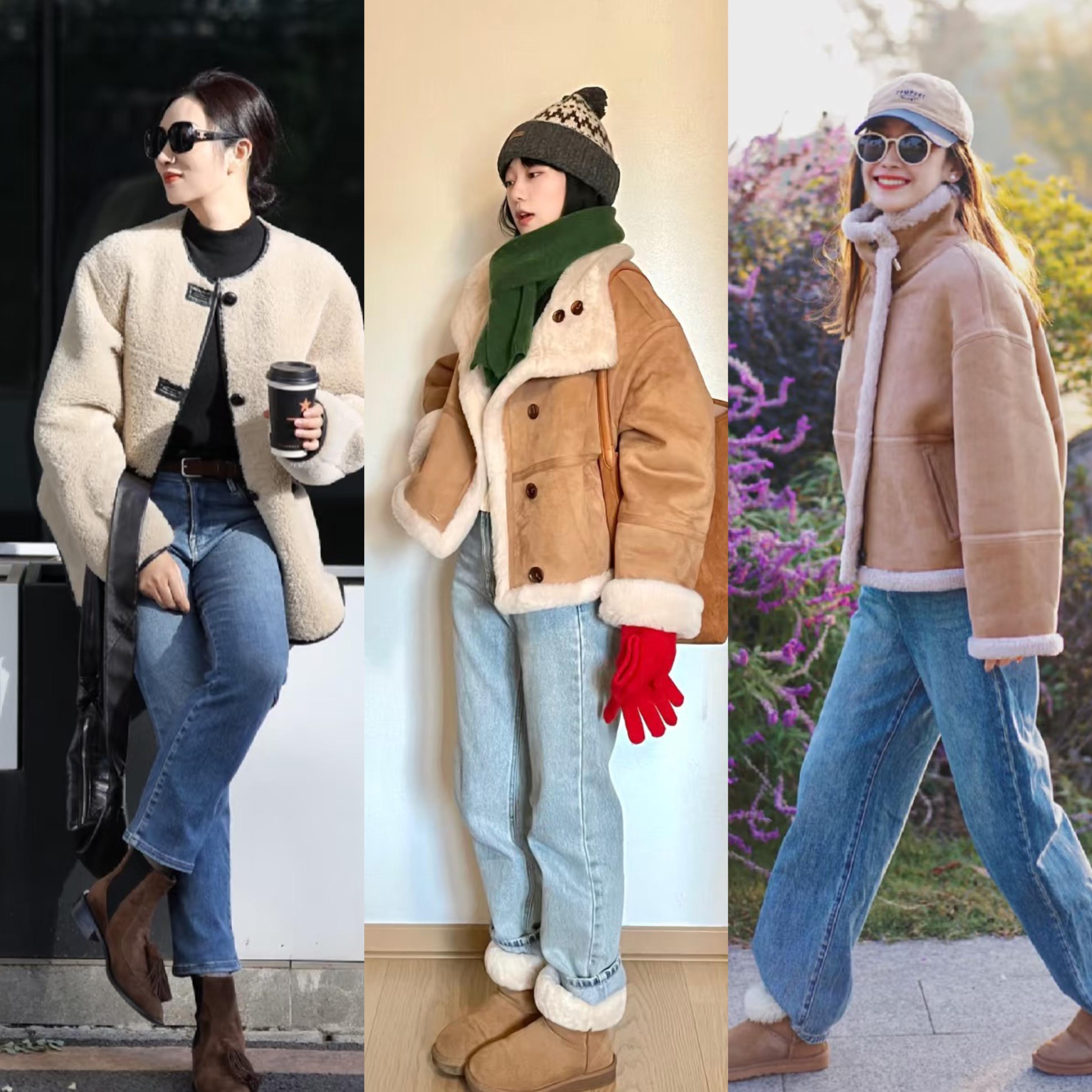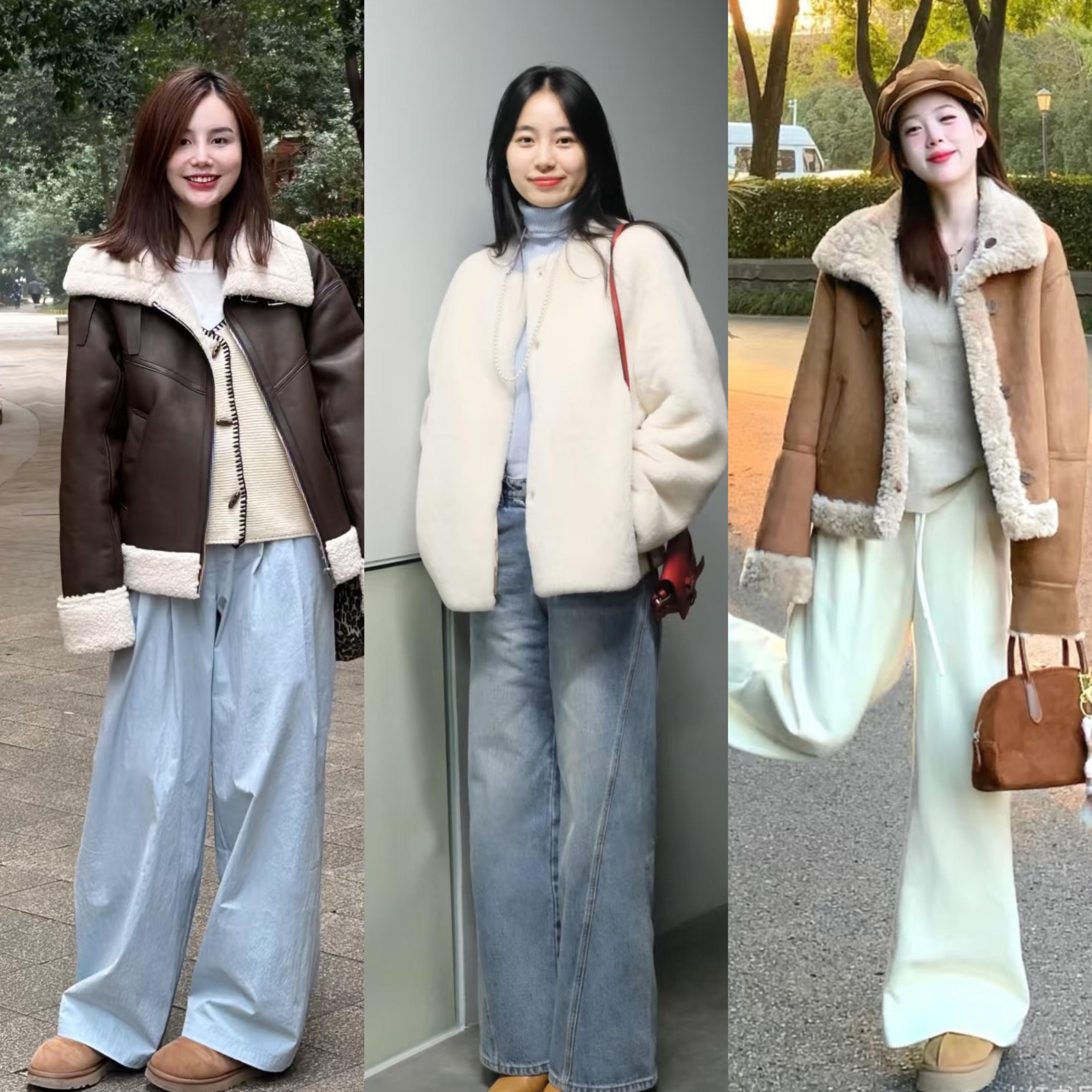 用皮毛一體外套搭配牛仔闊腿褲,也是又酷又美的。像這種牛仔闊腿褲,配上厚底的雪地靴,也格外保暖顯腿長。