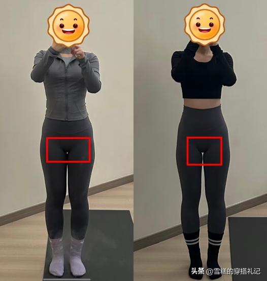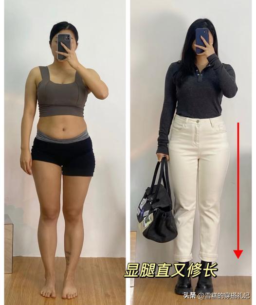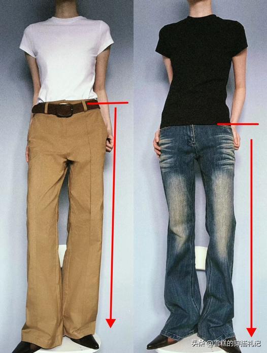 建議褲子選帶有高腰設計的款式,褲子向上延伸,縮短上半身的比例,能獲得黃金比例的身材,這纔是真正有效的拉長腿部。從上面的對比圖就可以看出,一個是高腰的全分褲,一個是低腰的全分褲,哪個腿長一目瞭然。