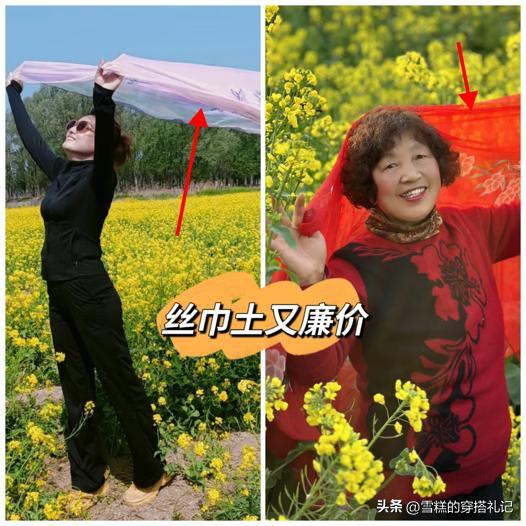 1、花色、面料輕薄的紗巾,顯眼又是大媽的標誌裝飾