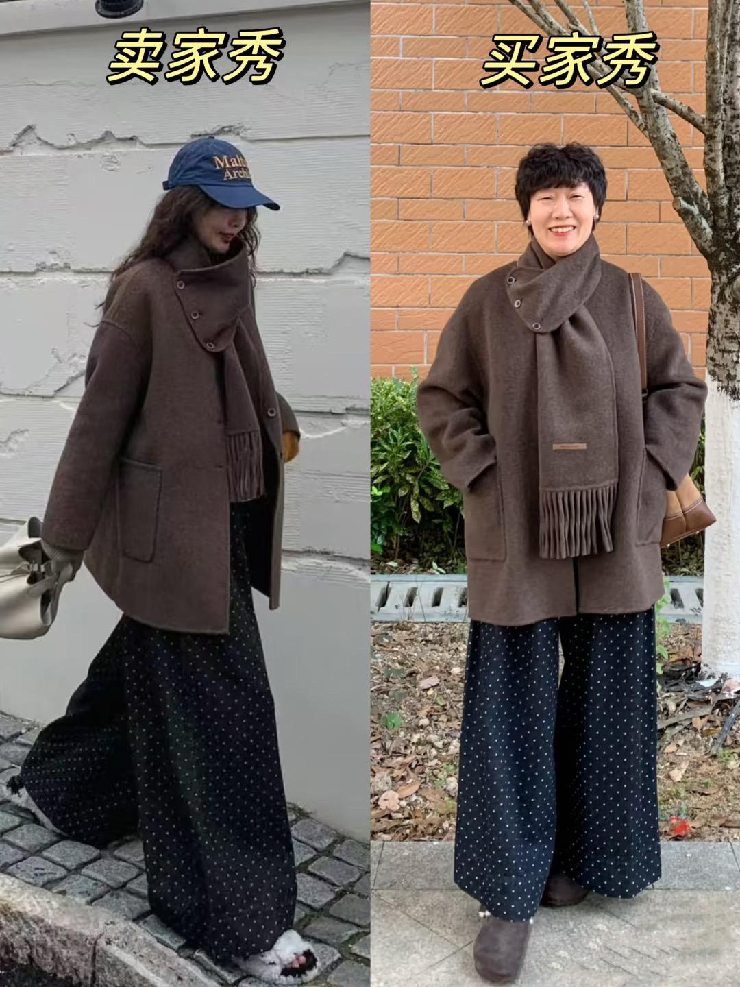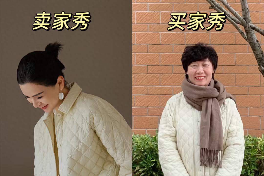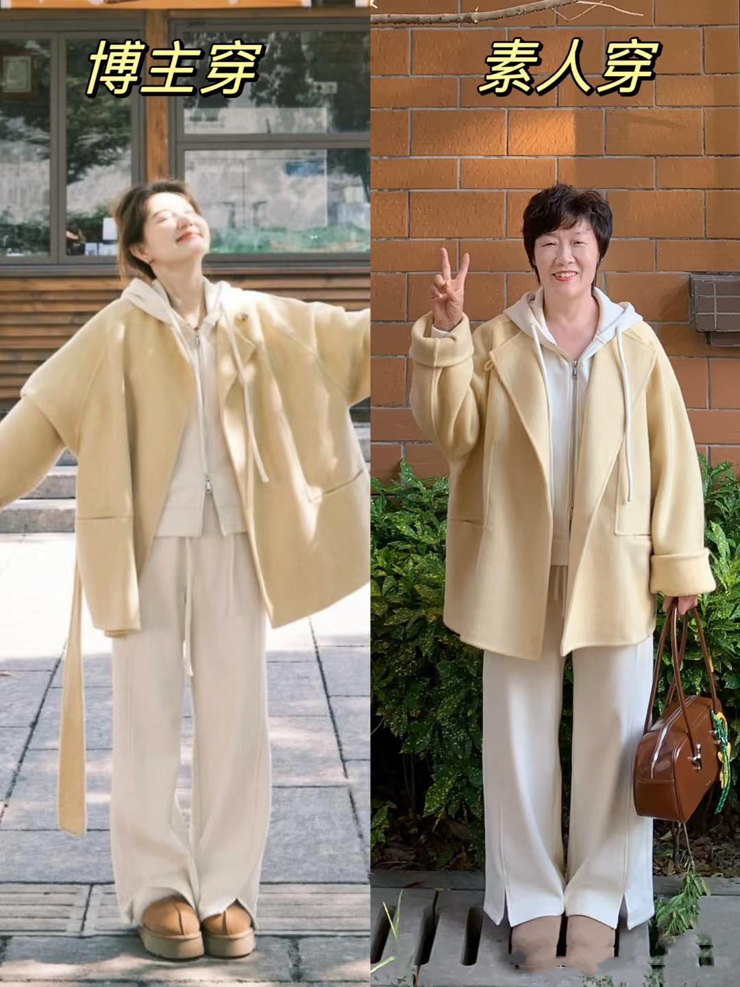 一身奶白色,特別溫柔。這種絎縫的棉衣,年輕博主穿溫柔體面。阿姨搭配同色系闊腿褲、配深色圍巾,好溫柔也很嫺靜。