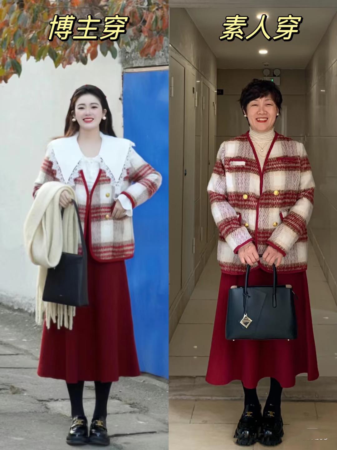 這種紅白格子的外套,搭配了紅色過膝半身裙,套裝的穿搭優雅體面。紅色過膝半身裙、傘裙的款式很顯瘦,遮胯顯瘦、配厚底樂福鞋顯得小腿更纖細。