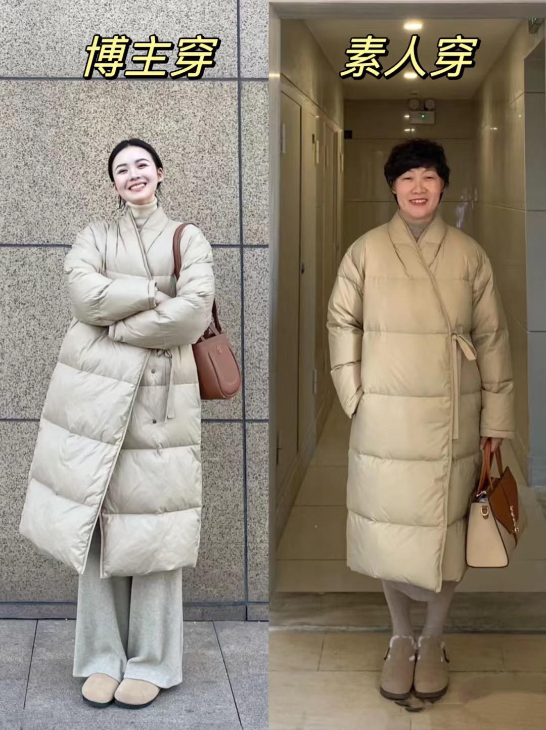 想要更保暖一些,我們也可以嘗試棉被一樣的羽絨服。其實大齡阿姨穿棉被款羽絨服,也可以很溫柔、很洋氣,而不是像個糉子。