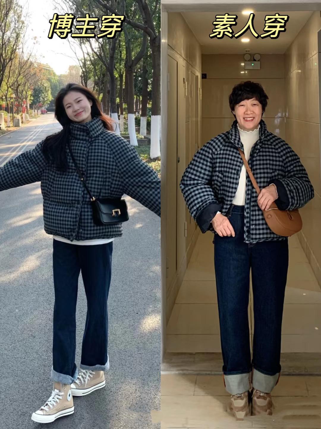 短款的千鳥格羽絨服,搭配高腰的深藍色牛仔褲,上短下長的組合太顯腿長。高腰的深藍色直筒牛仔褲,卷邊款式也很顯腿長。