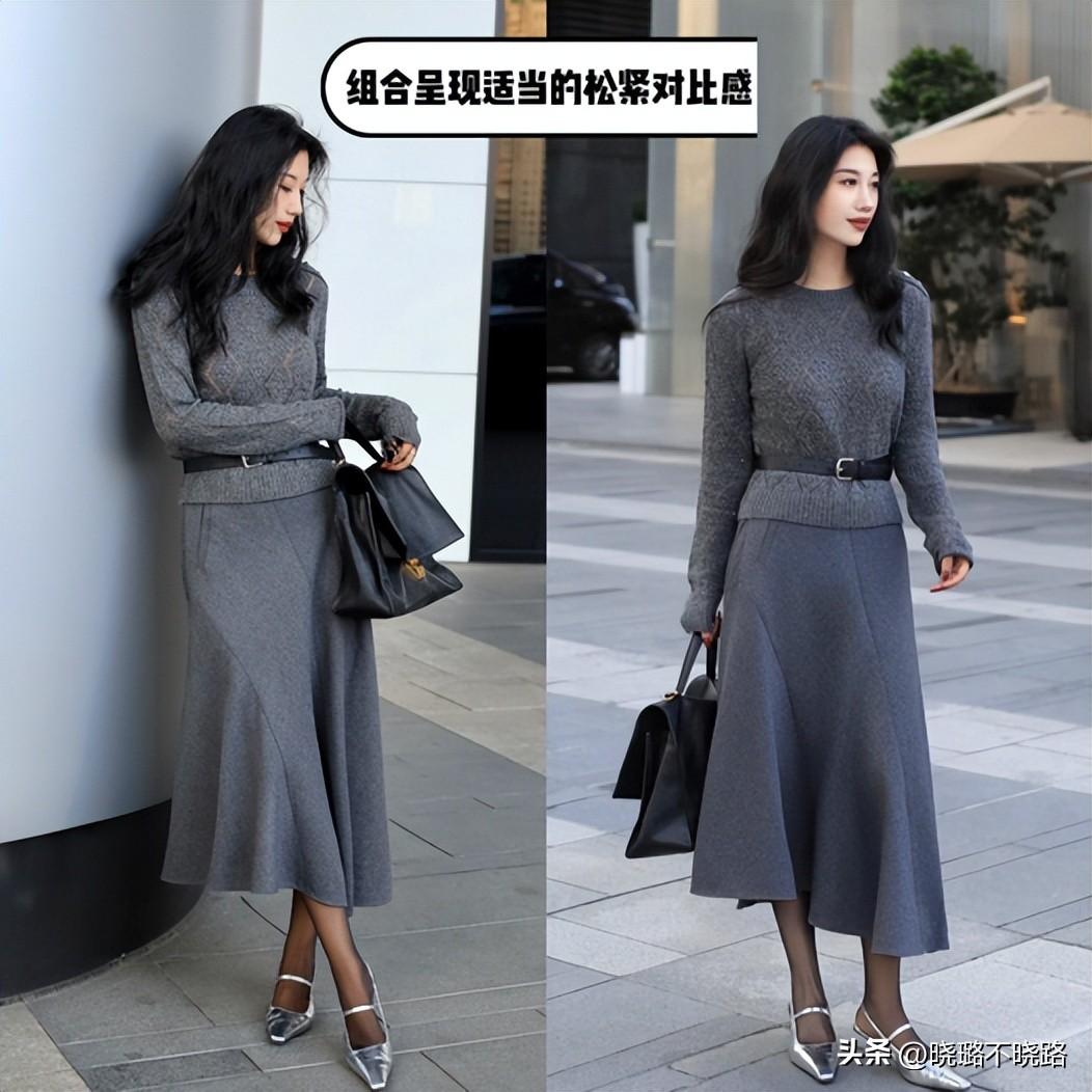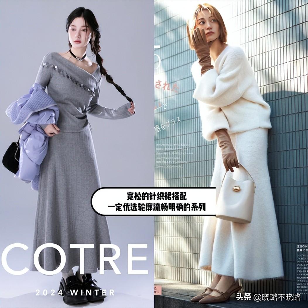 組合系列的搭配就可以呈現一定的視覺對比了,例如上半身可以優先於選擇搭配比較修身的單品與寬鬆的針織裙能夠在視覺上呈現一定的對比效果。