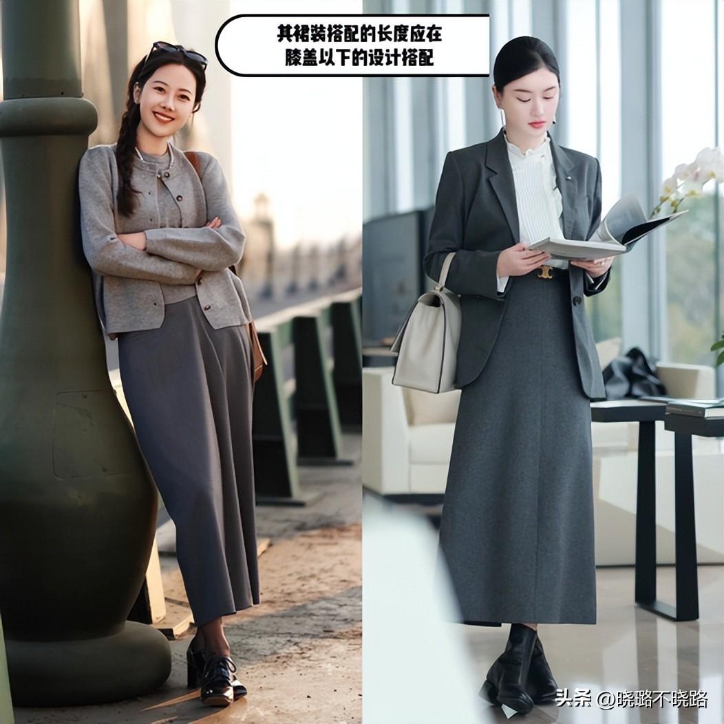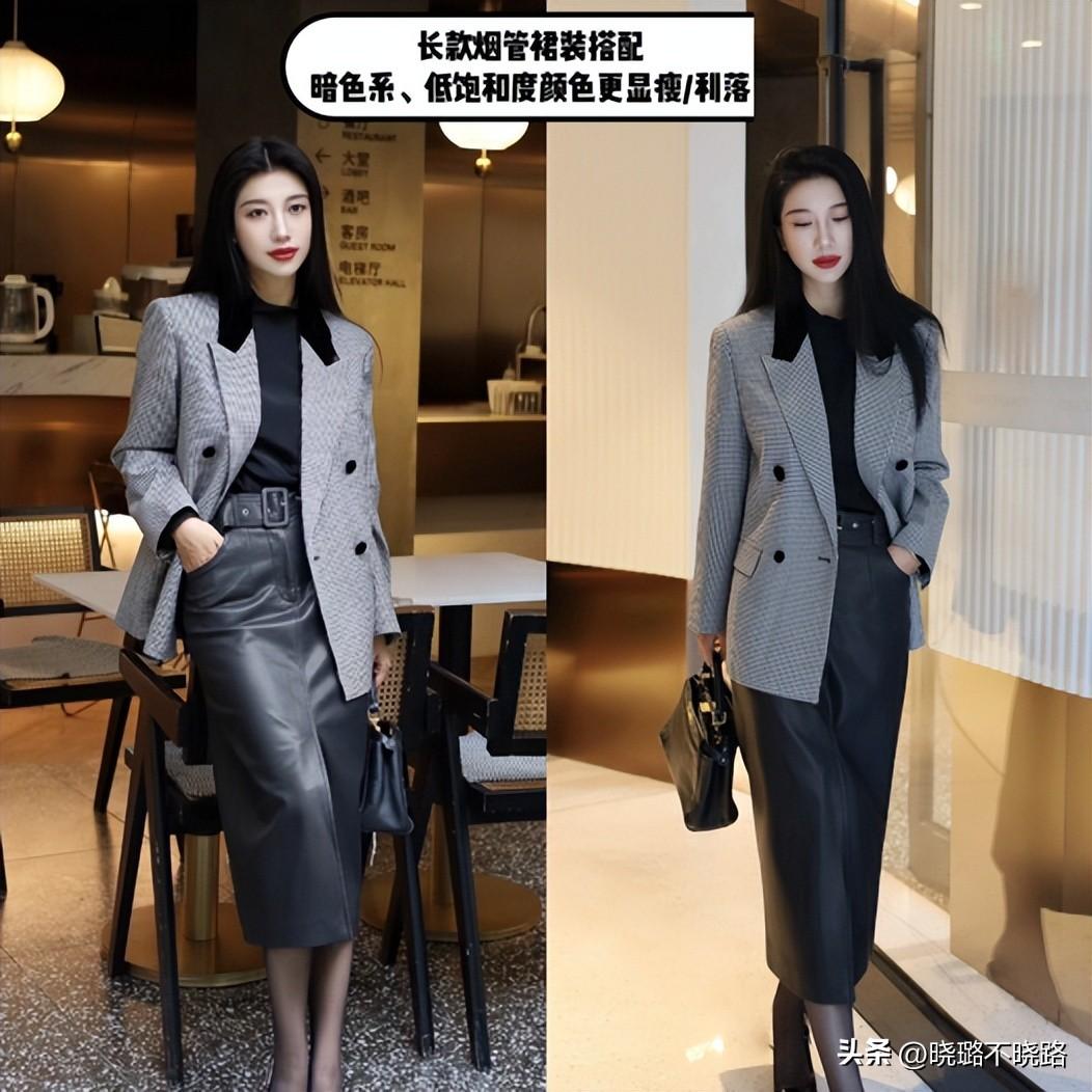既然裙裝的穿搭優勢是凸顯下半身的線條流暢利落,那麼在視覺上就更推薦大家可以優選搭配暗色調、或者其飽和度較低一些的顏色,搭配起來的時候會更具有顯瘦+強調流暢感線條走向的優勢所在,如若你本身腿型較爲粗壯的話,那麼搭配煙管裙切記{穿黑色/深色爲主}。