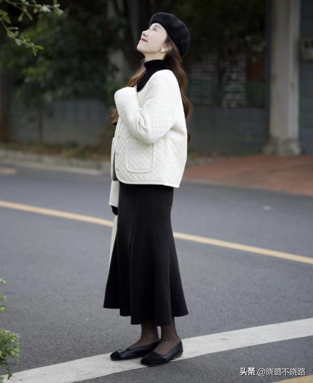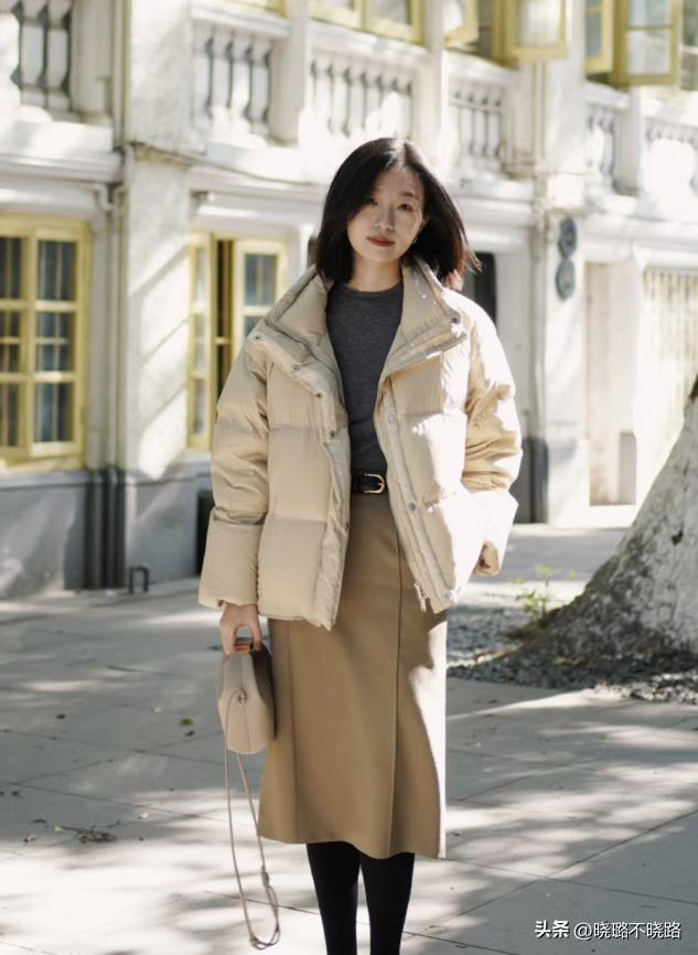 穿法2、短款羽絨服+過膝長裙,溫柔知性有氣質