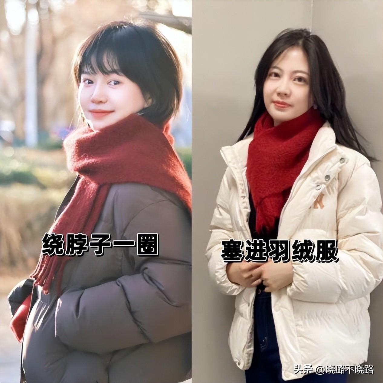 最簡單的佩戴方式就是繞着脖子一圈,這樣可以增加保暖,同時還可以使得上半身更加的有層次,非常適合北方怕冷的女人。但如果想要更加的優雅精緻,可以將圍巾折一折,下襬塞進羽絨服的領口裏,只露出圍巾的一角,整體給人超級會穿的精緻感。