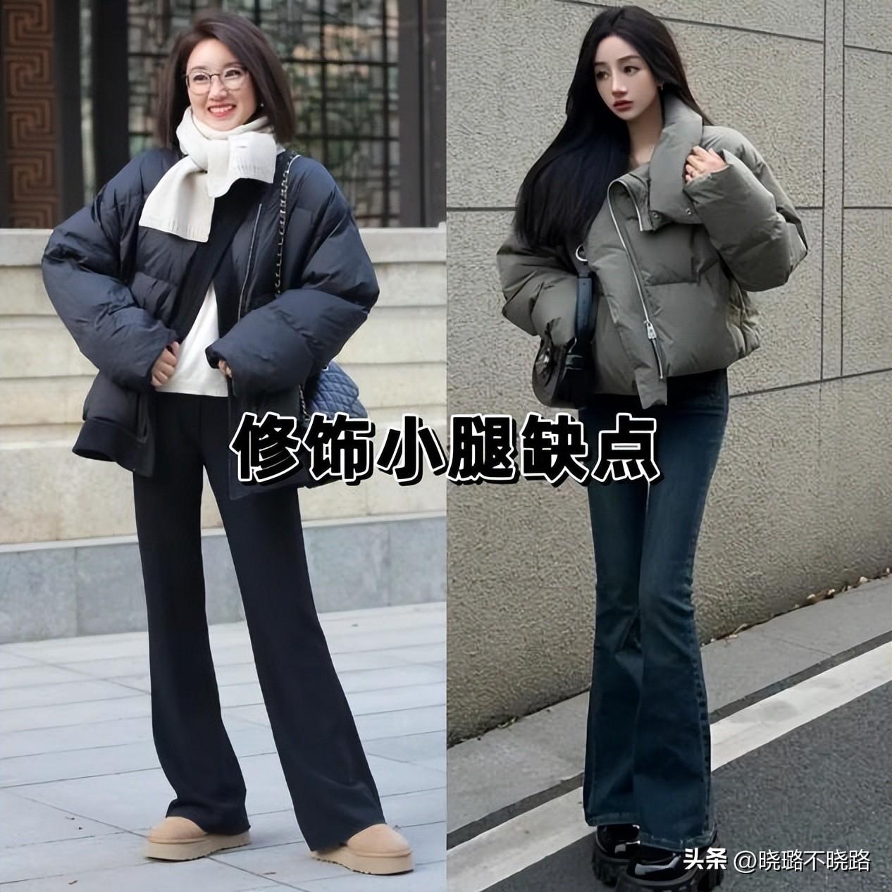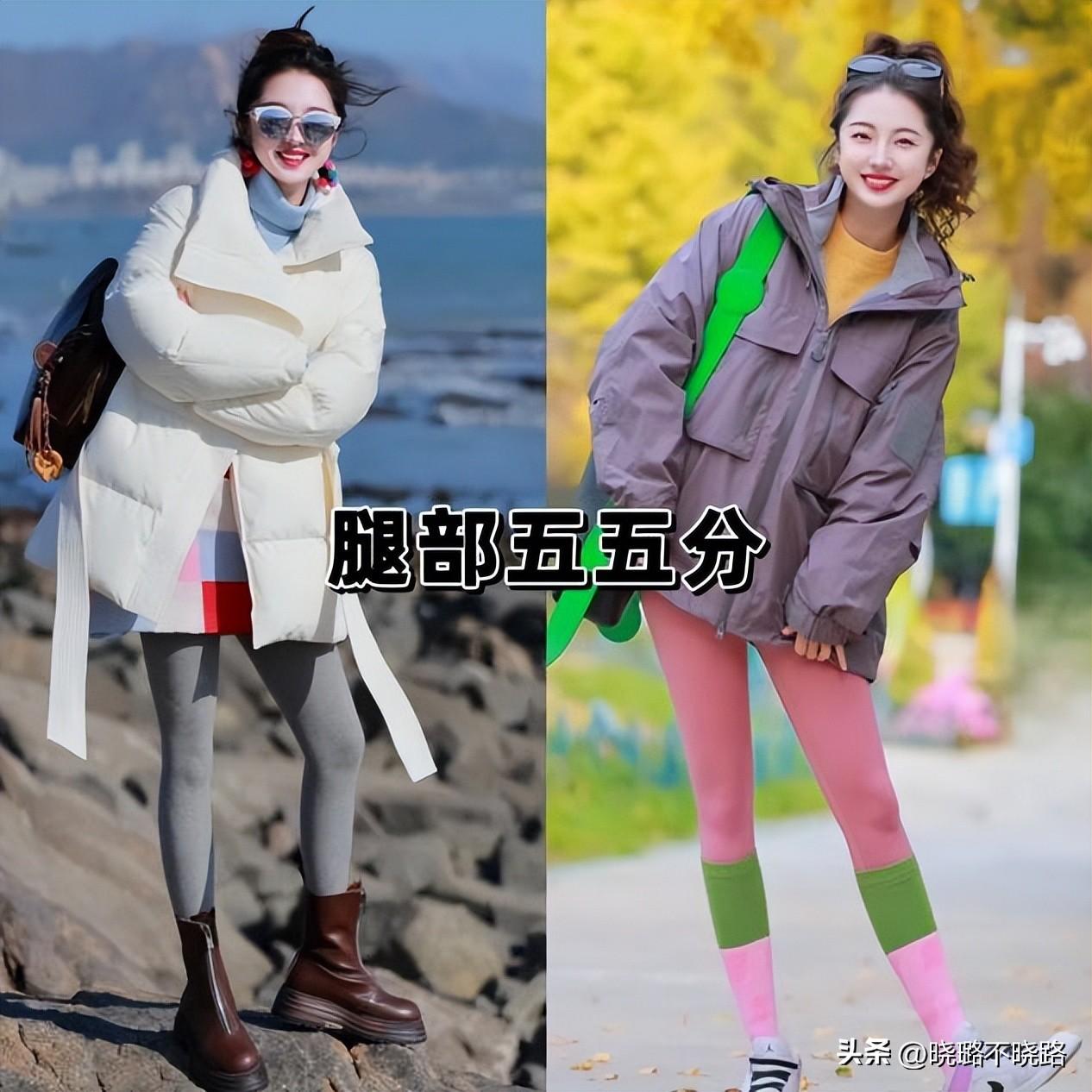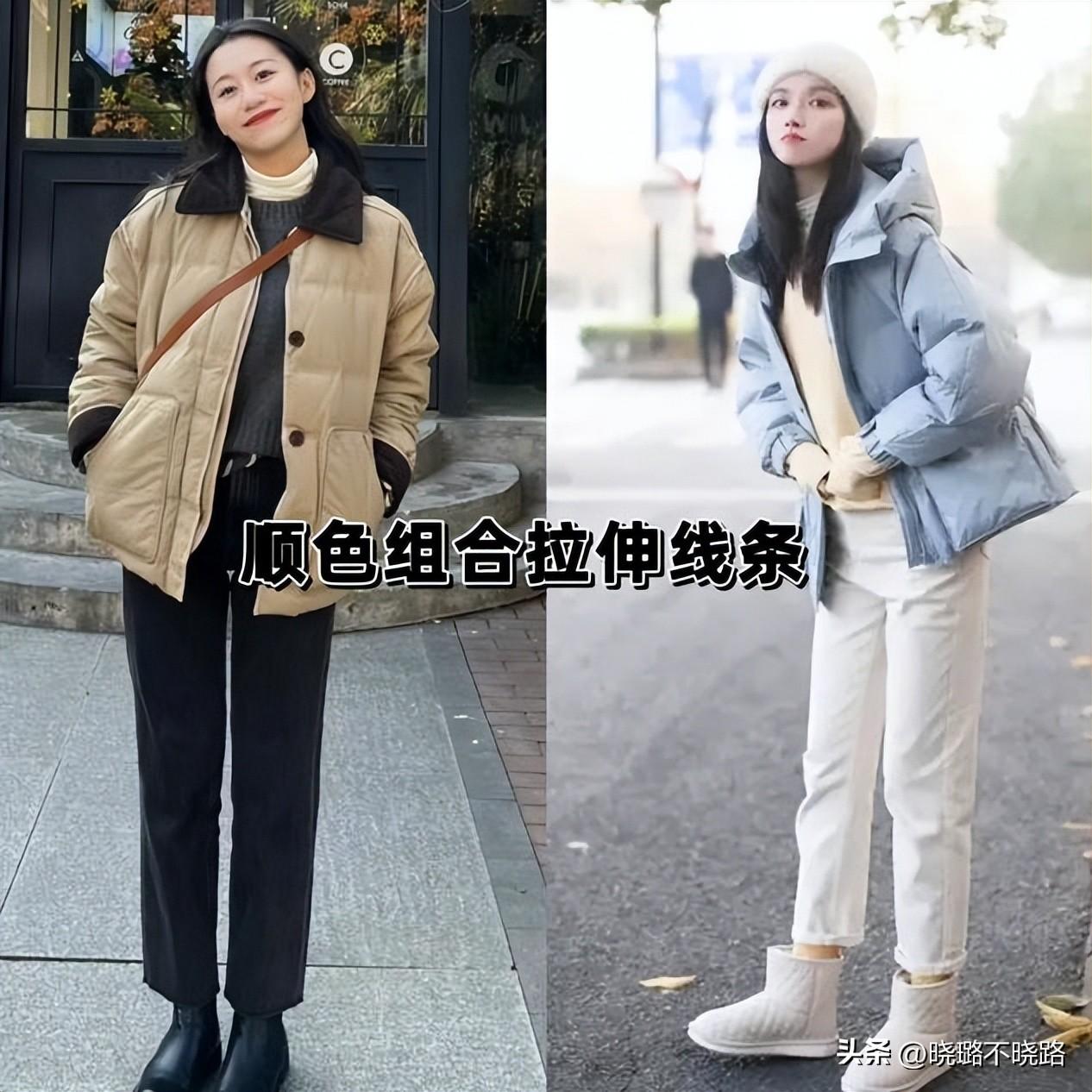 想要將羽絨服穿的幹練利落,首先應該避開多段式疊加下裝,簡單的說,就是不要選擇裙子或者短褲配打底褲的組合,好幾件夏裝,疊加在一起,容易放大腿部的量感,不僅看起來顯得腿短,給人一種邋遢的感覺。