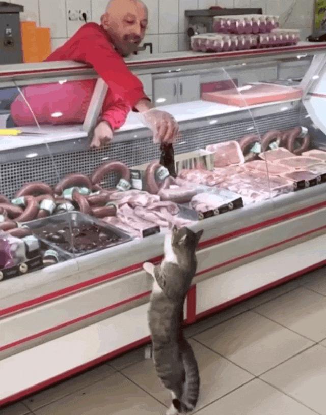他看着小貓咪走進店裏,爬上擺放着各種肉的櫃檯,伸出雙爪似乎想要討要什麼。