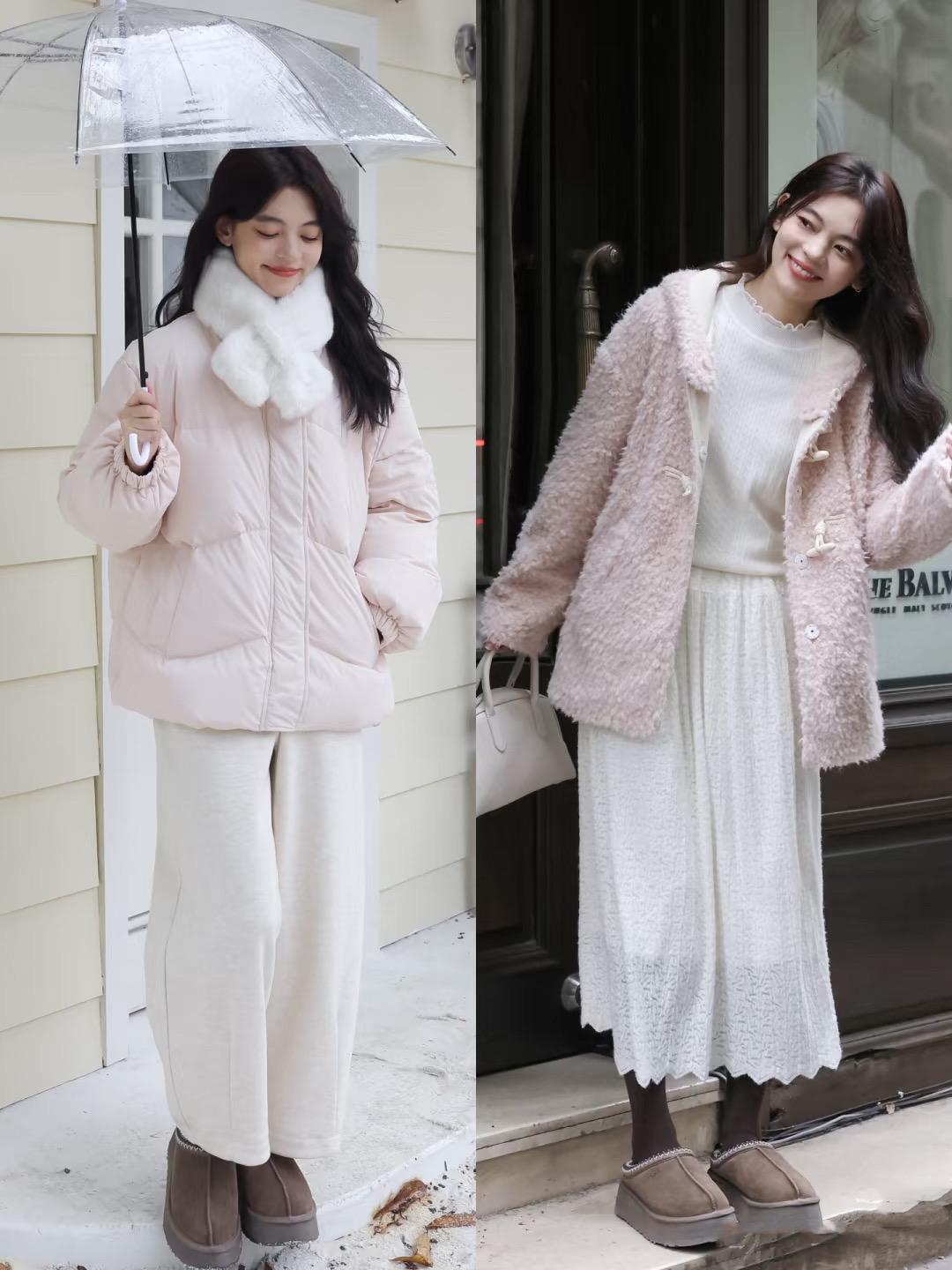裸粉色的羽絨服,配上米白色的毛呢闊腿褲,溫柔又大方。其實粉白配色也是很柔和、有着小女生的甜美。白色毛呢褲配厚底的雪地靴,足夠保暖。