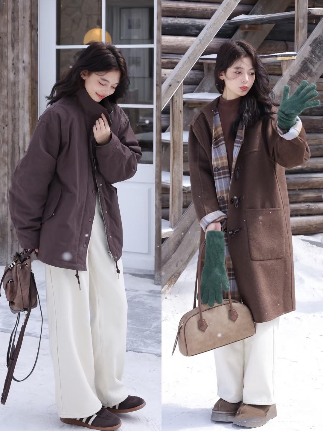 我們用焦糖色大衣,來搭配白色直筒褲,是乾淨又大方的美。白色直筒褲可以配加絨的款式,防風保暖,又不會壓個子。