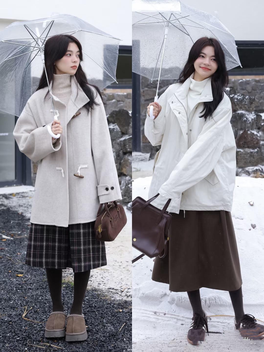 到大腿長度的牛角扣大衣,有一種學院風獨有的氣質,配上千鳥格的半身裙、是很優雅很別緻的美。千鳥格半身裙,配厚底雪地靴也是超時髦。