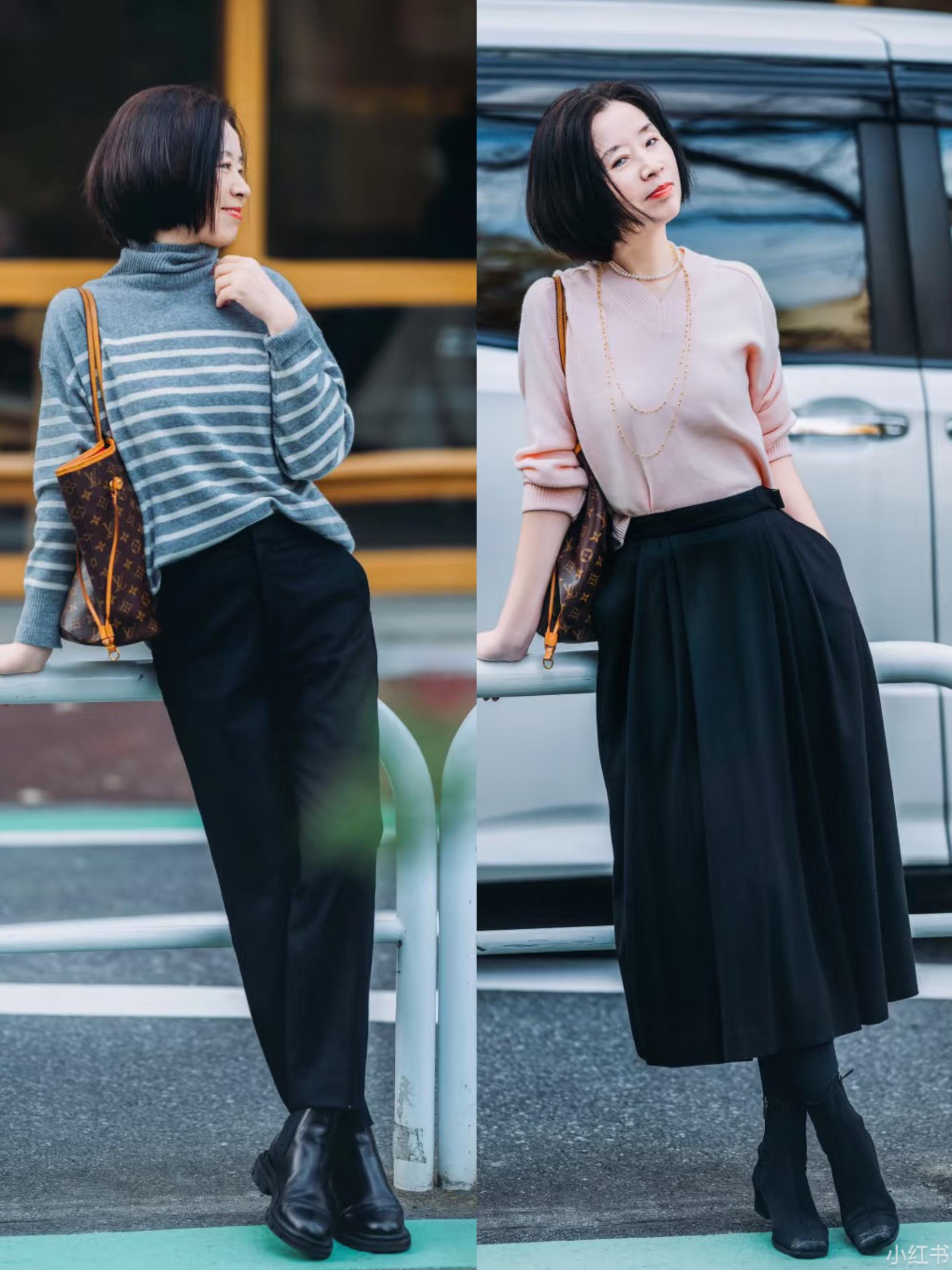 比如裸粉色的針織衫、直接配黑色的半身裙,既優雅大方又多了幾分清甜。屬於一種很柔和、很減齡的打扮。黑色半身裙,也足以遮肉顯瘦。