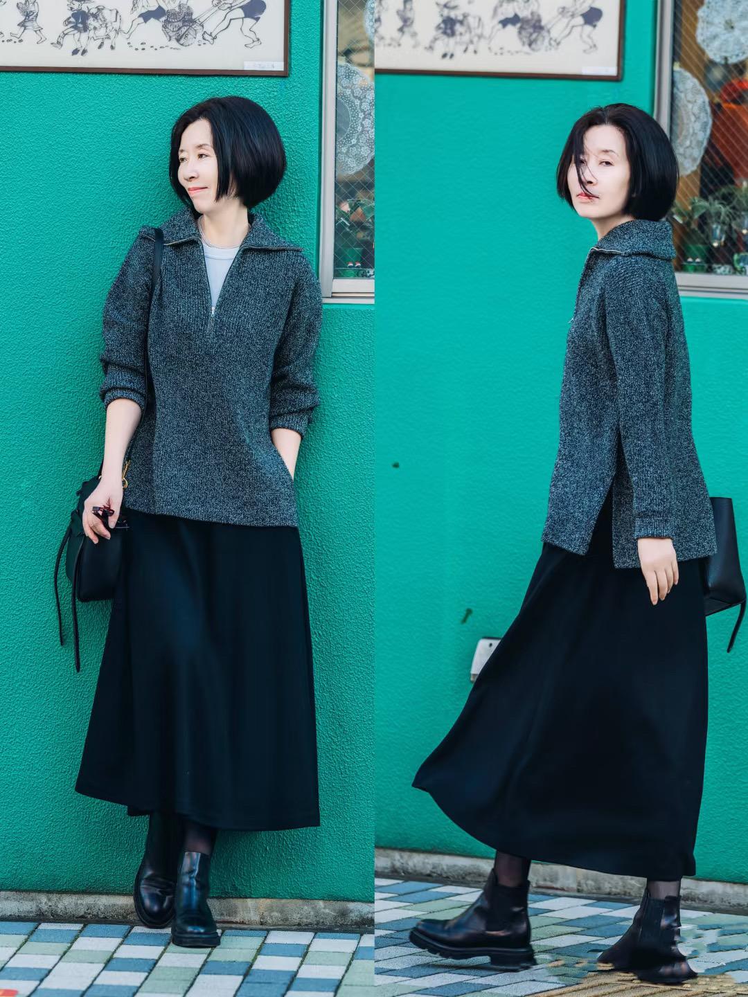 時髦的半拉鍊毛衣,這種花灰色就特別養眼。即便是配最簡約的黑色半身裙、方頭短靴都時髦耐看。過膝半身裙厚實一點的面料,也足夠溫暖。