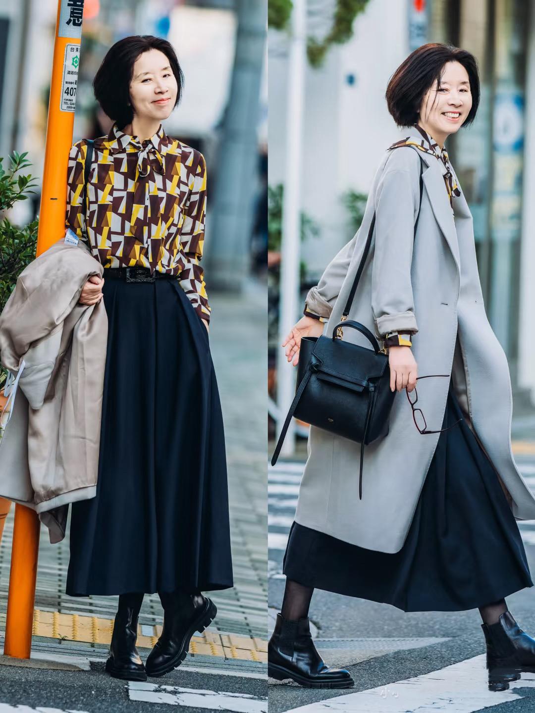 優雅利落的長大衣,真的是與半身裙更配。像這種過膝的半身裙、立體的百褶剪裁,包容性特別強。