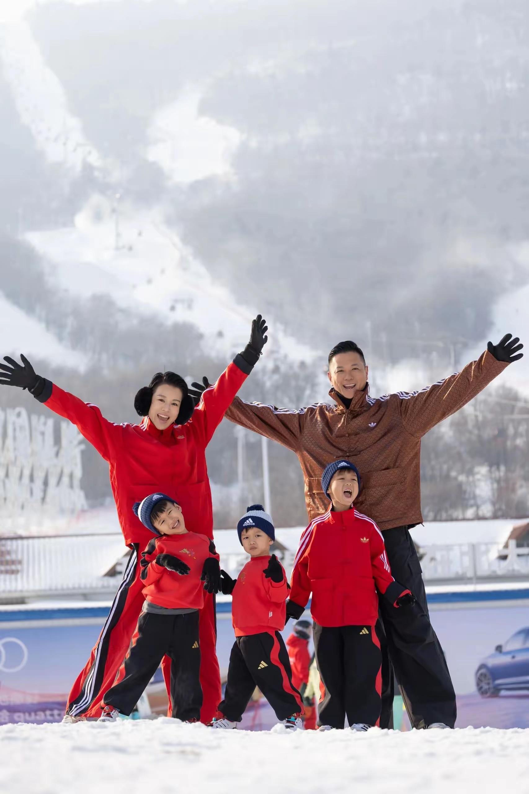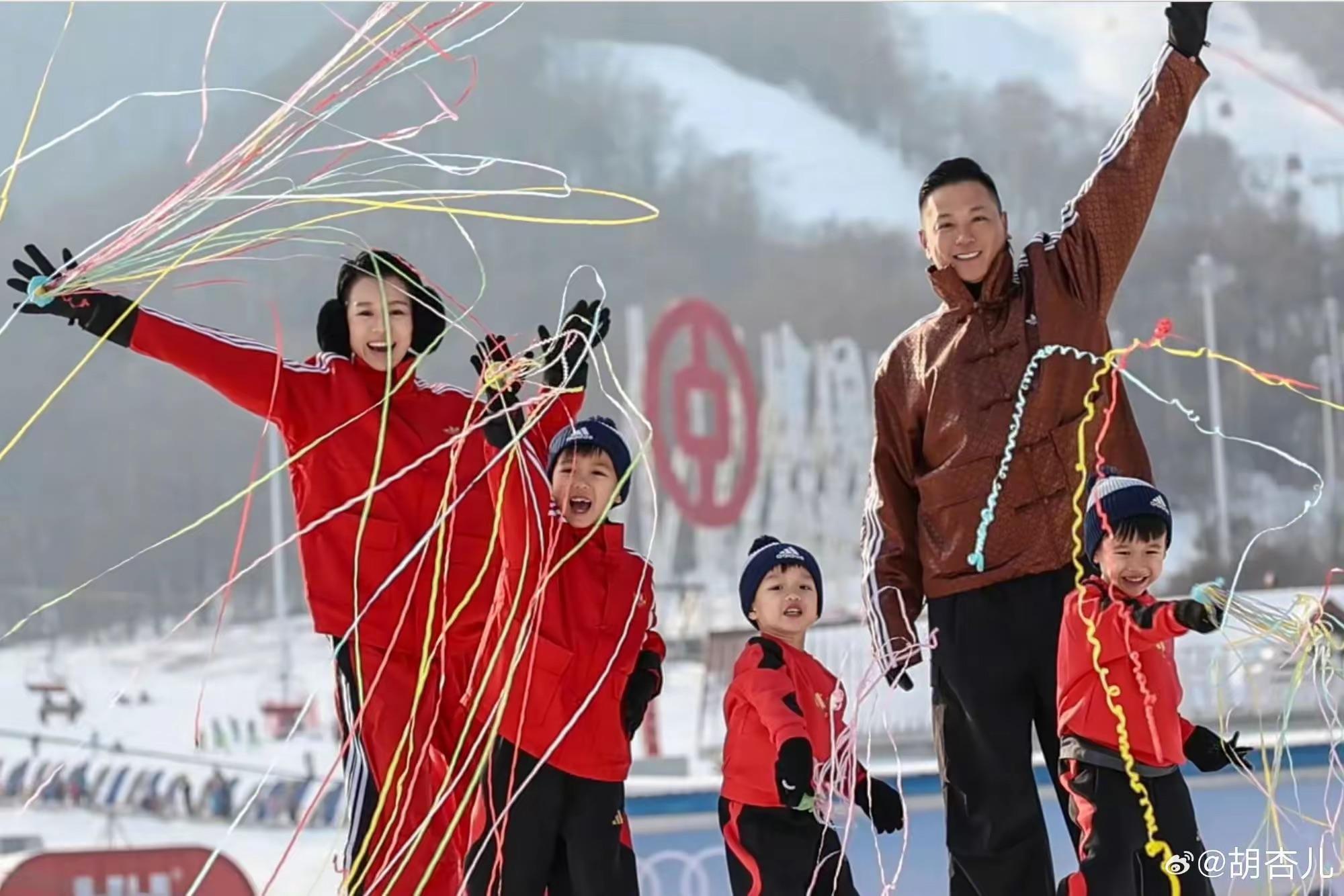 胡杏兒一家去滑雪啦,夫妻倆穿情侶棉襖秀恩愛,兒子們穿同款衛衣