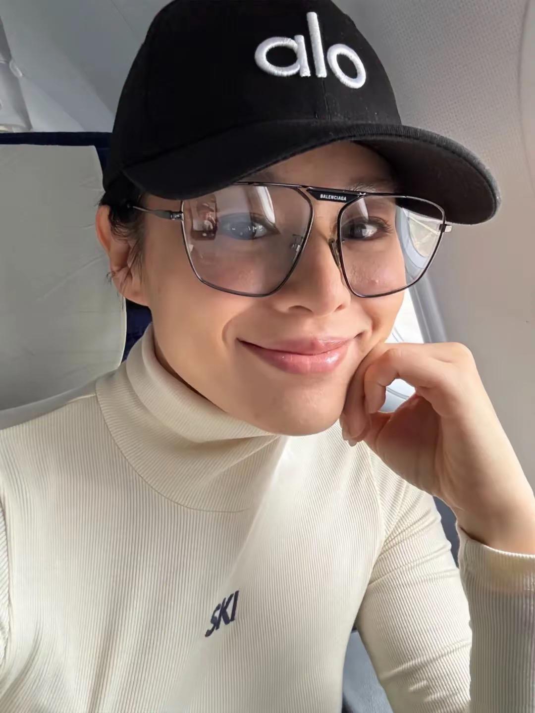 讓大家猜猜她去哪裏,看她穿着高領的針織衫、特別輕薄的款式,帶着黑色鴨舌帽、素顏出鏡非常顯年輕。
