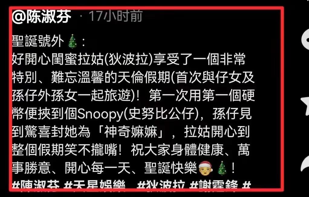 娛樂圈裏的聖誕節,真的是熱鬧非凡。先是劉亦菲王詩齡、李現合影衝上熱搜,又是王菲拍了今年的廣告大片,而謝霆鋒更是罕見的帶着兩個到日本,還給老媽繼父安排了燭光晚餐。