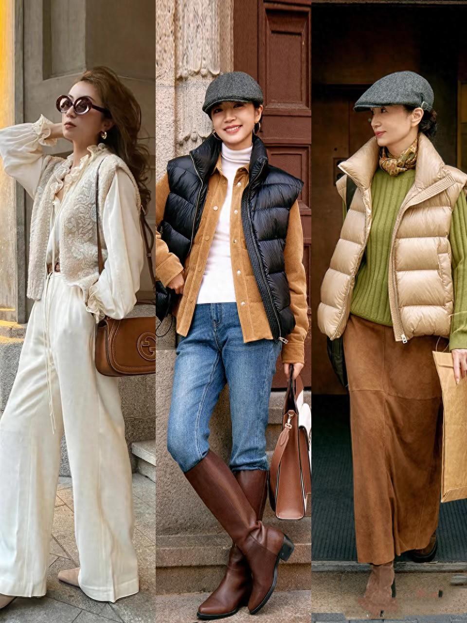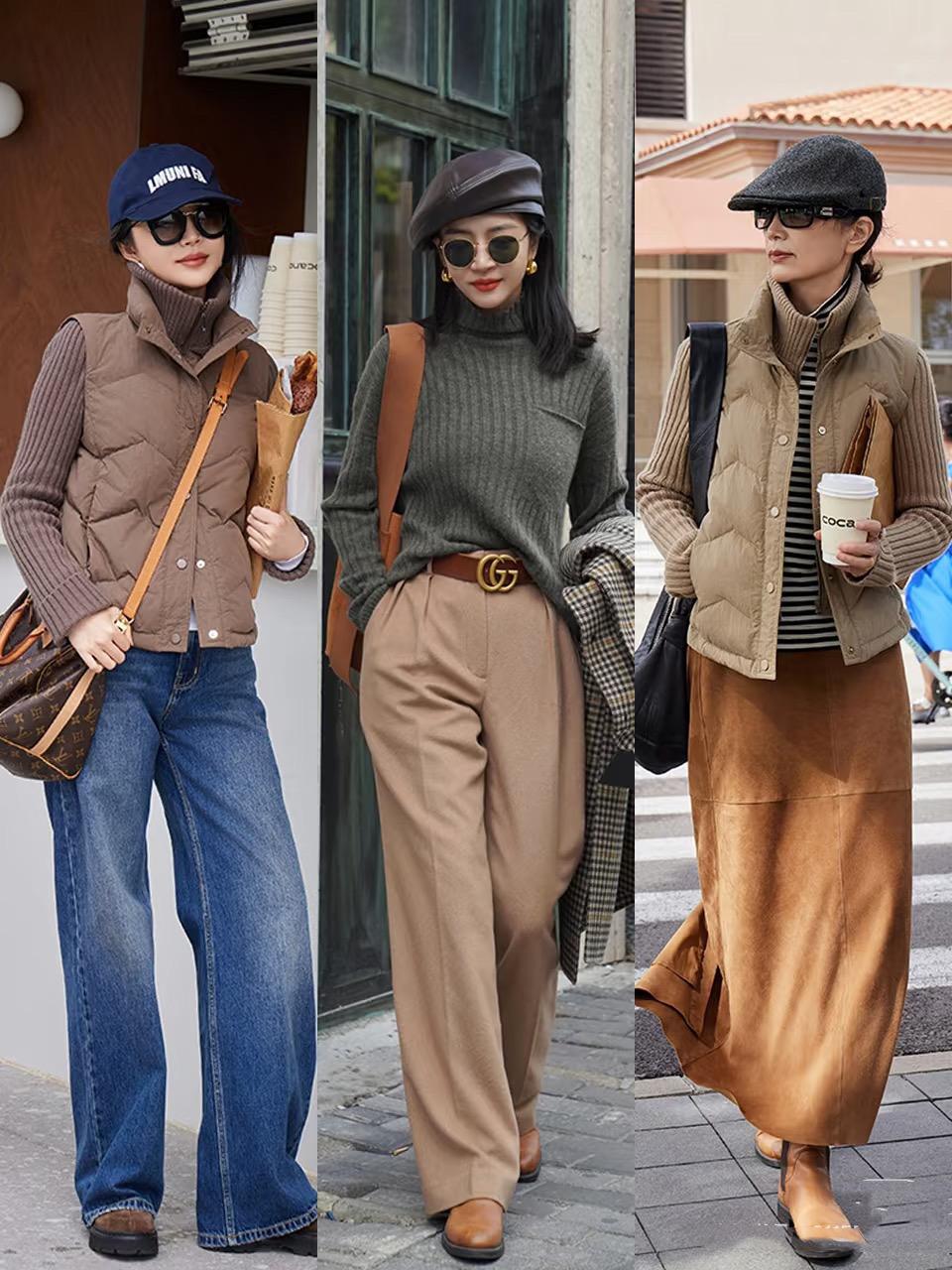 比如高領的毛衣,疊搭羽絨馬甲,馬甲同樣是豎領的款式。如果將馬甲的領口拉鍊完全拉起來,就會掩蓋層次感,讓穿搭變得單調、乏味。
