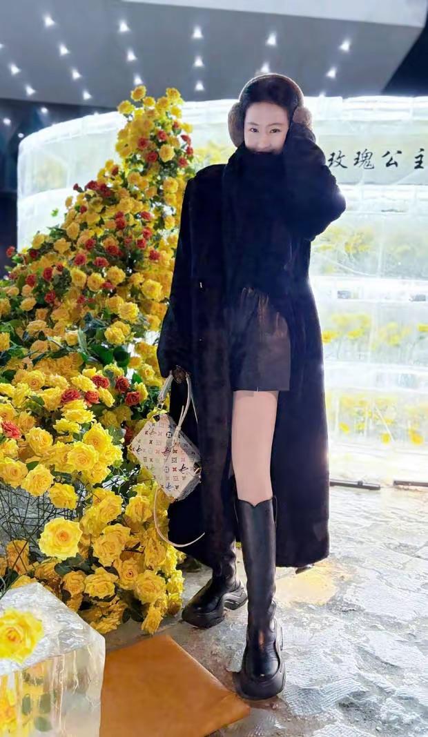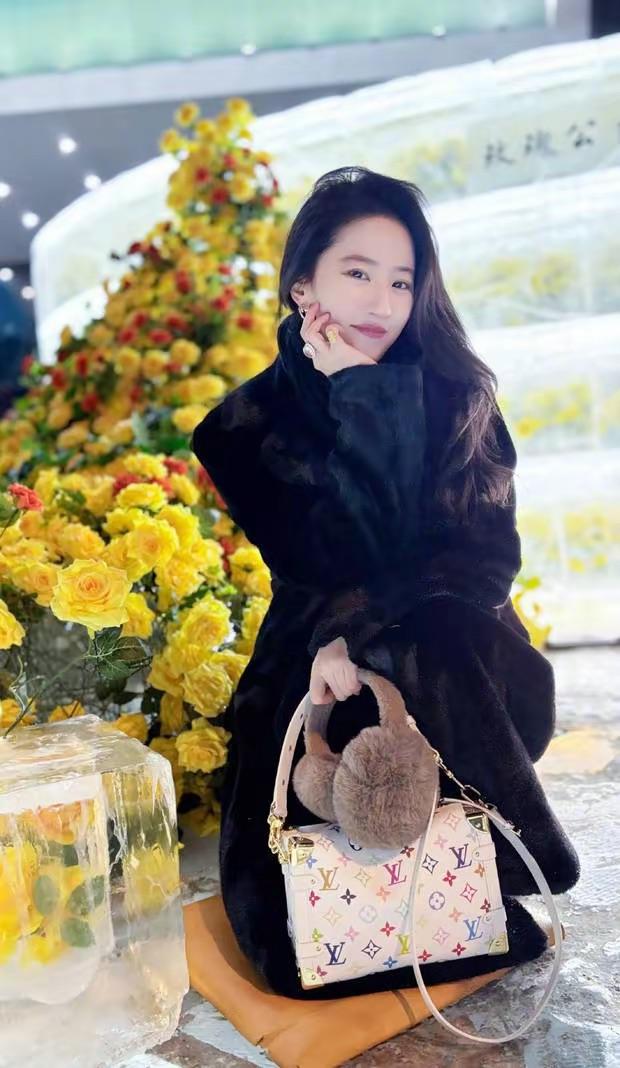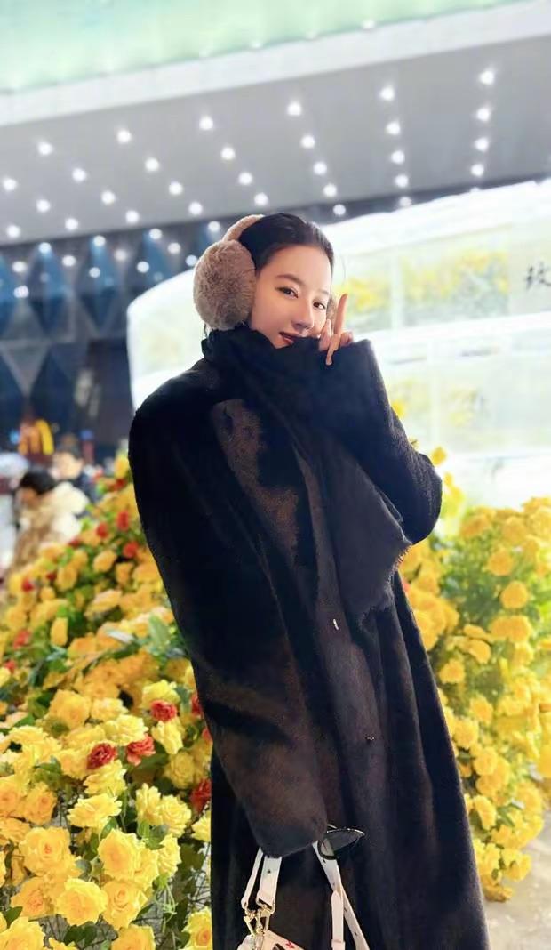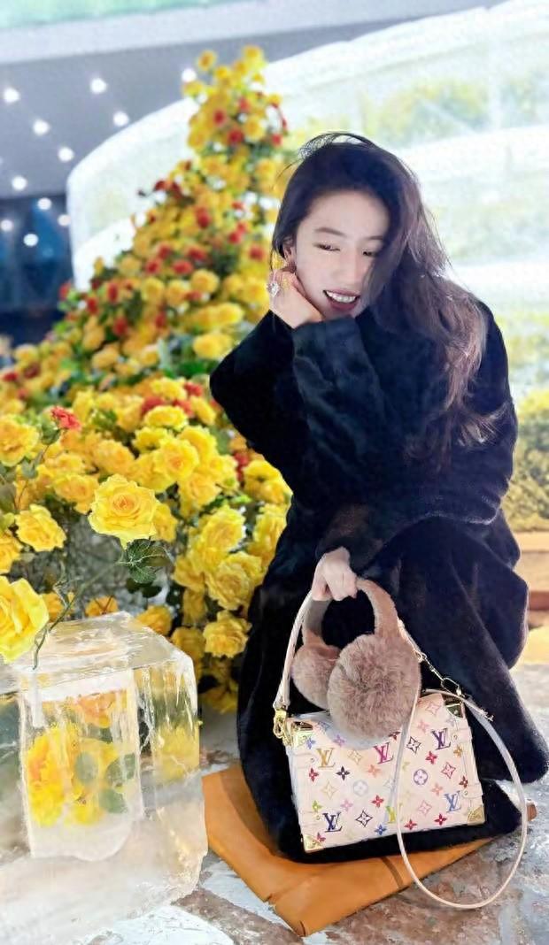 劉亦菲打卡黃玫瑰,穿貂皮大衣戴超大鑽戒真貴氣,媽媽是哈爾濱人
