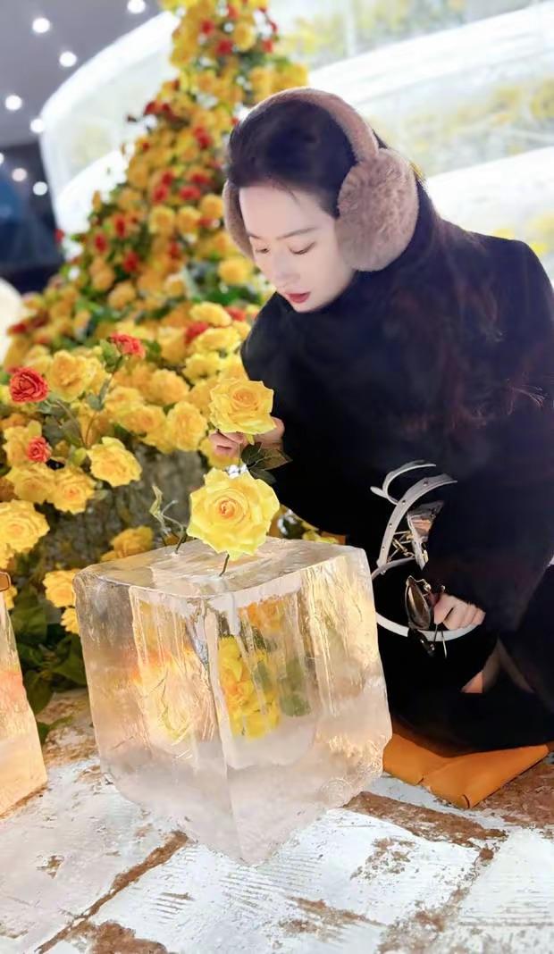 看劉亦菲蹲在冰封黃玫瑰跟前合影,她穿得非常貴氣又時髦。