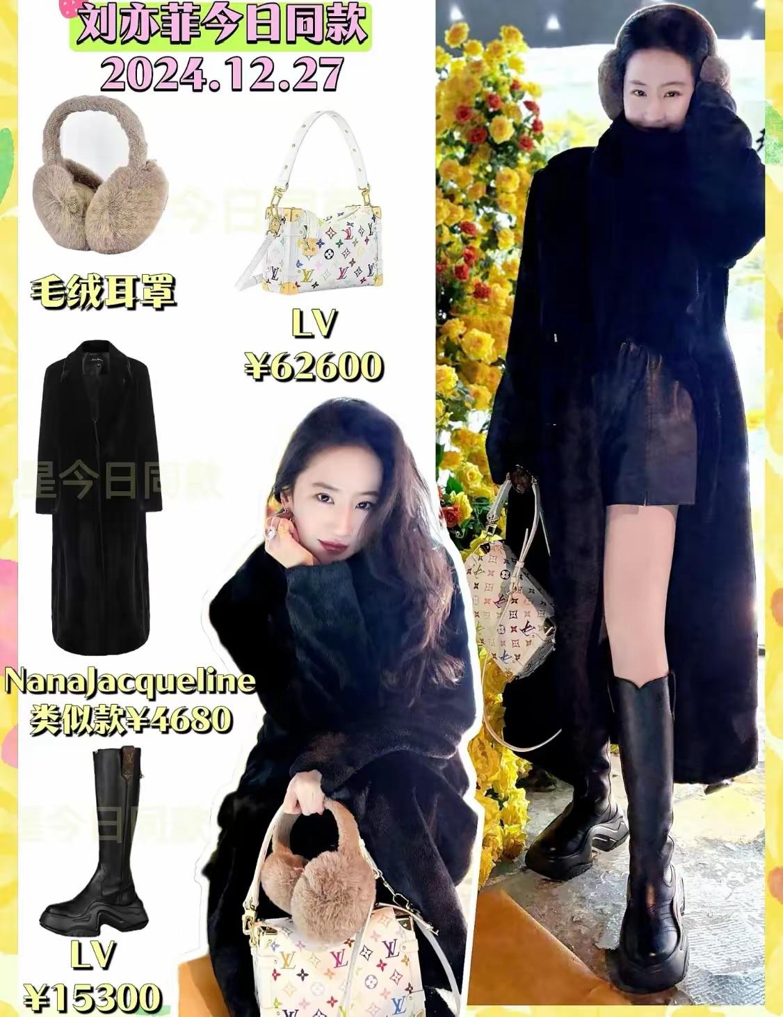 長筒靴、厚底的款式,也是LV系列,一雙一萬多的靴子,顯得劉亦菲的雙腿又細又直,整個人又高又美。
