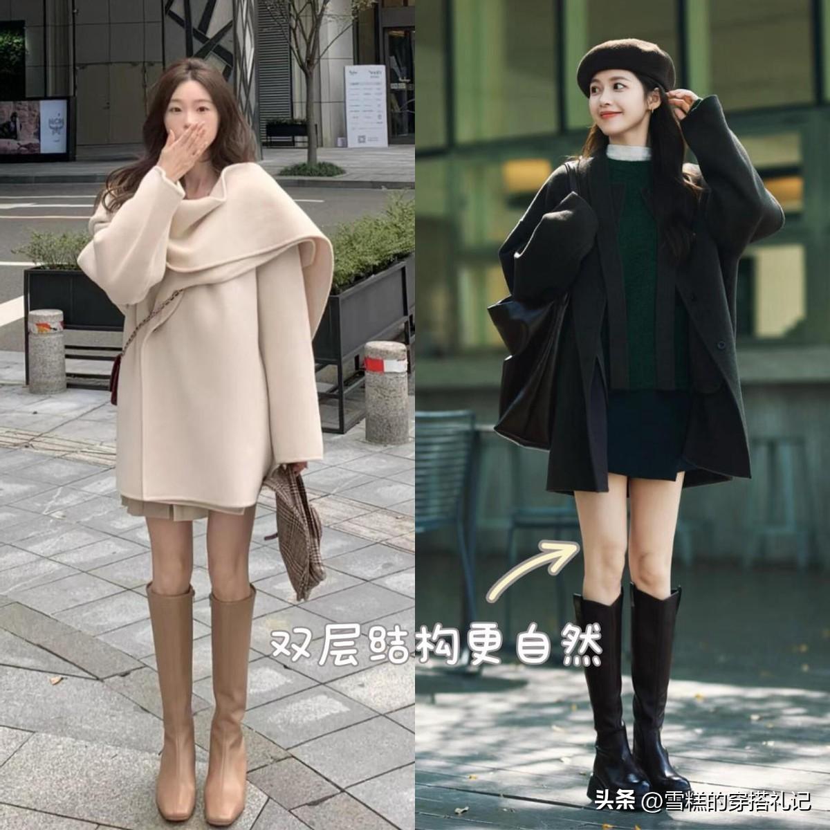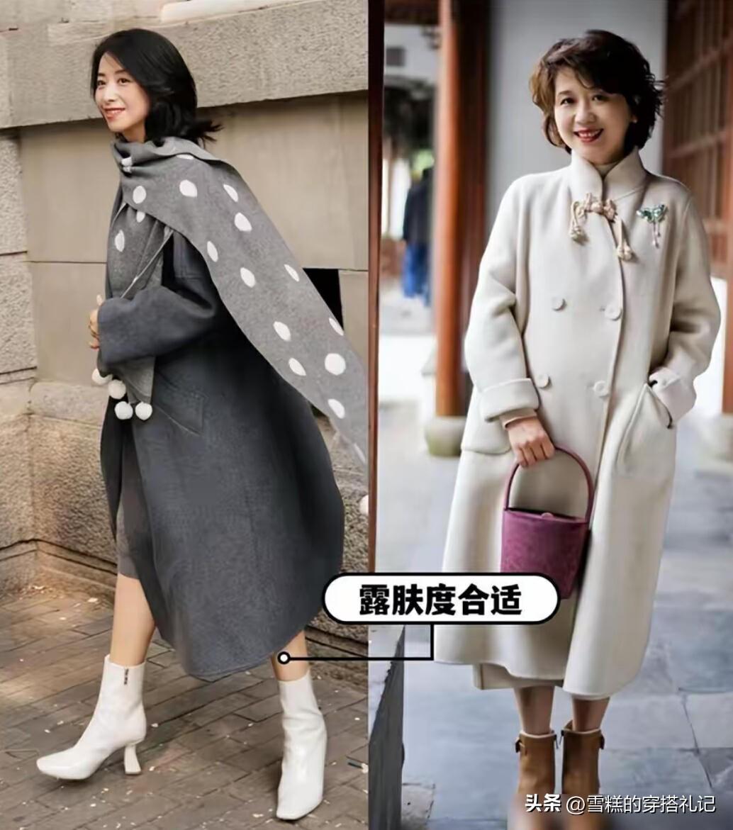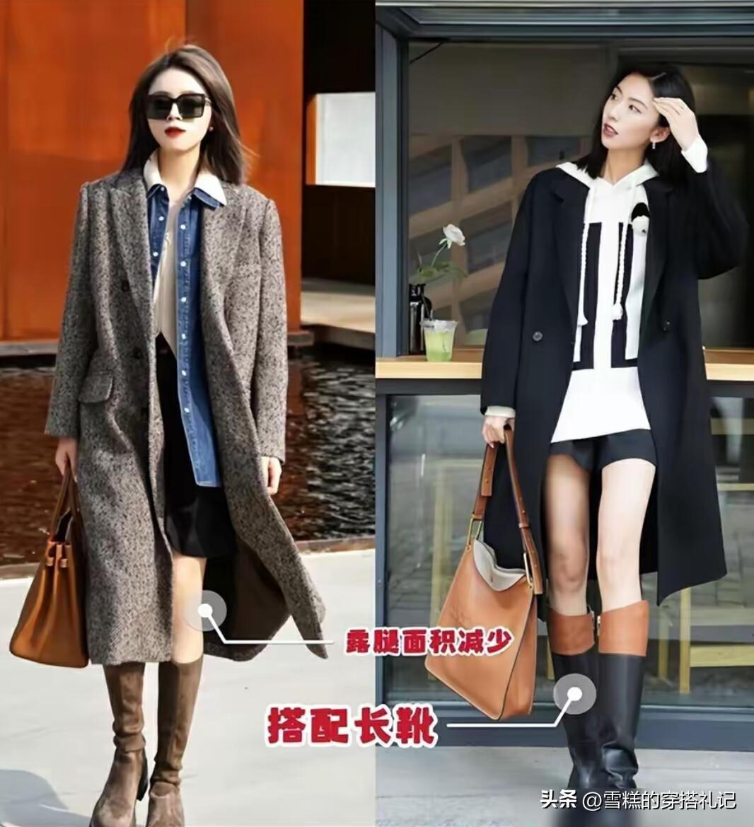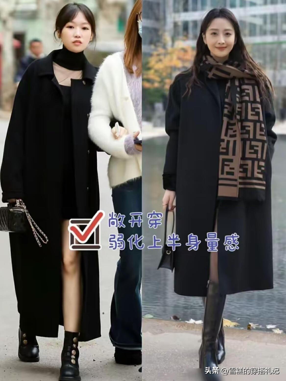 冬天在嘗試“露腿穿搭”時,建議大家可以控制好露腿面積,尤其是將大衣敞開穿的時候,下裝儘量不要太短,長度遮住一半大腿,能夠成功的弱化上半身量感,從而避開顯壯的問題。