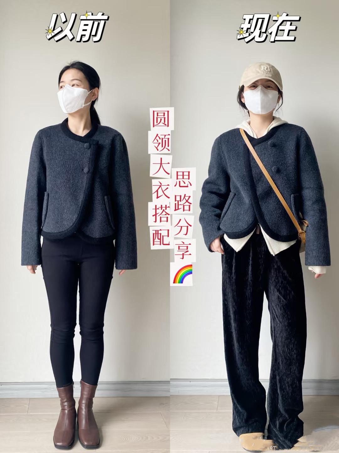 圓領的毛呢外套,簡簡單單的、有一種很舒適很精緻的美。但是配小腳褲、黑色打底衫,土味十足。