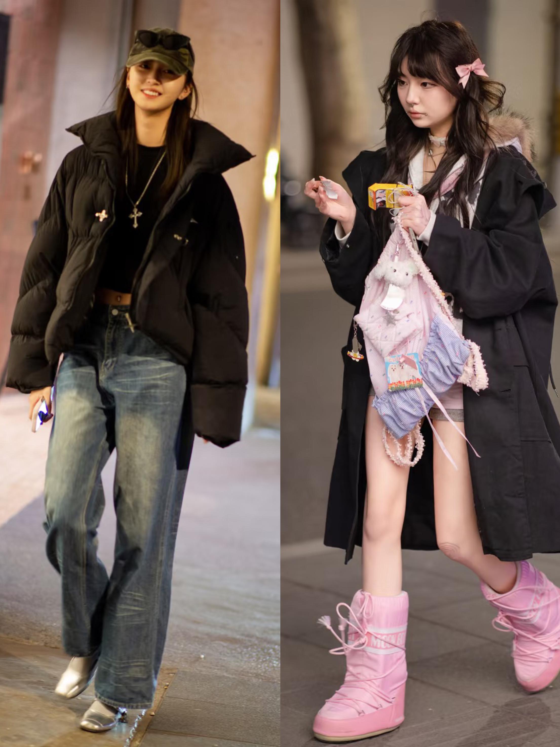 黑色的羽絨服,配上粉色雪地靴、粉色包袋、以及粉色蝴蝶結髮夾,那麼甜那麼美。這種蘿莉風穿搭,也非常讓人喜歡。