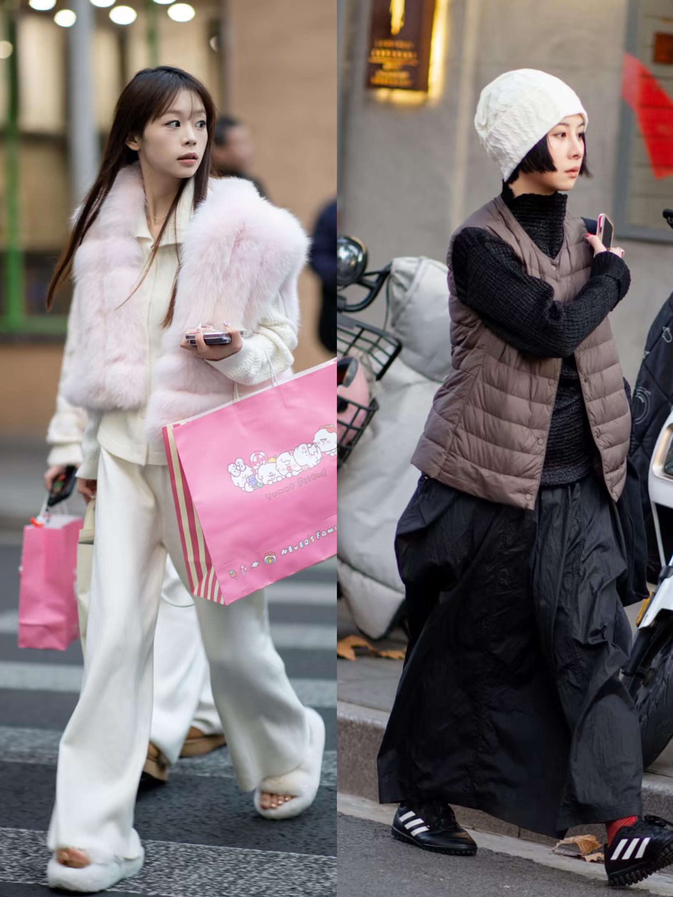 粉色皮草馬甲,那麼甜、那麼嫩,配白色針織套裝,也是溫柔又減齡。而最醒目的還是腳底的毛毛拖鞋,露着腳趾頭也不會尷尬。