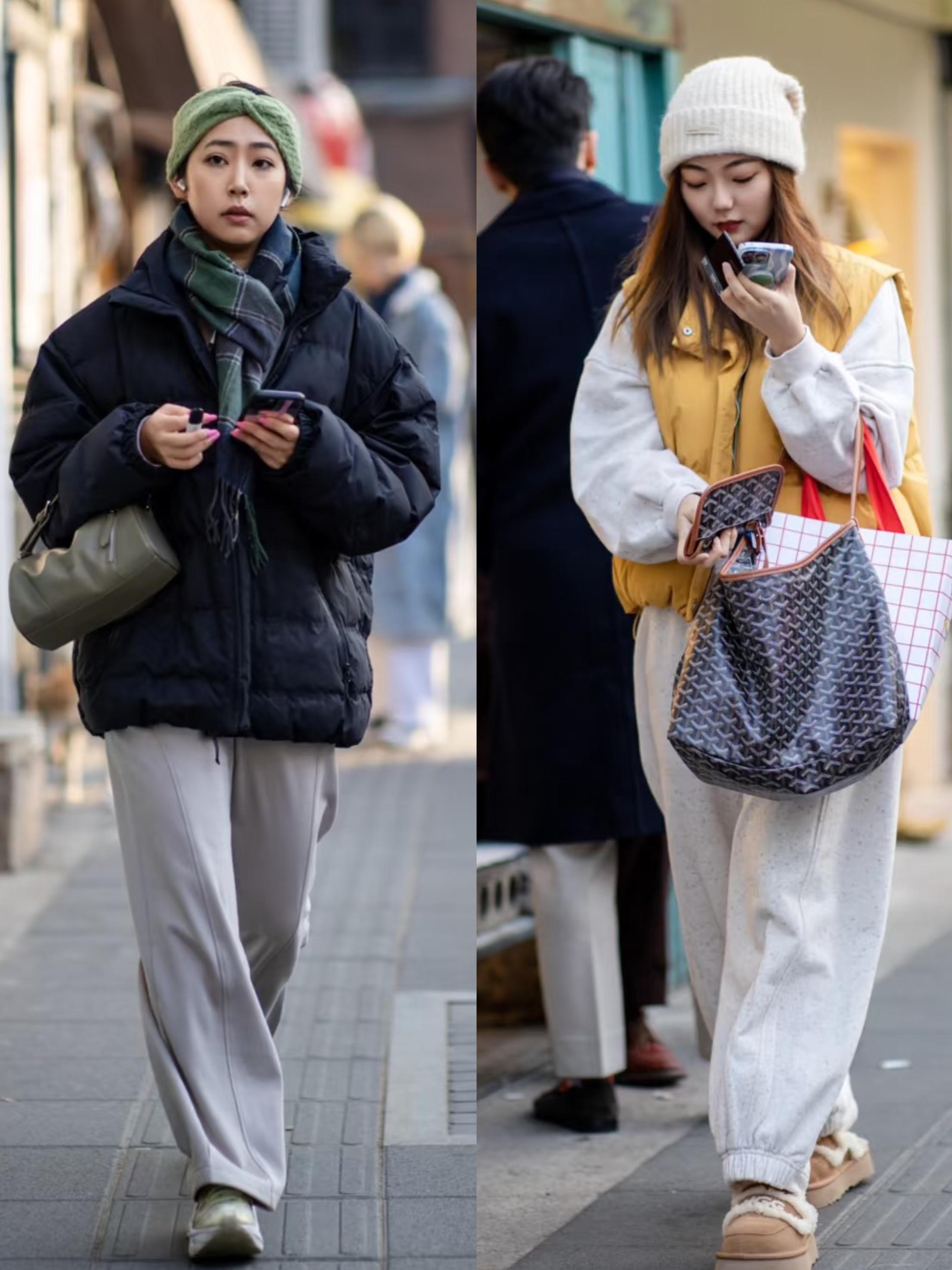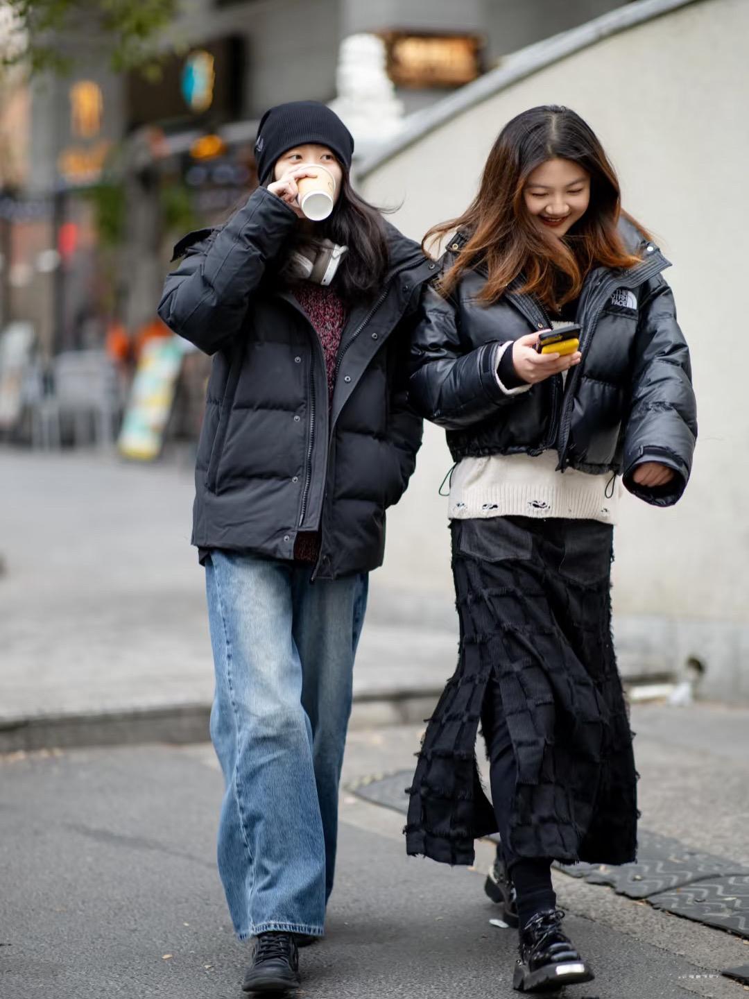 短款的羽絨服,可以配牛仔褲、也可以配半身裙。半身裙選擇開衩的剪裁、隨着步履搖曳生姿,更多了浪漫姿態。