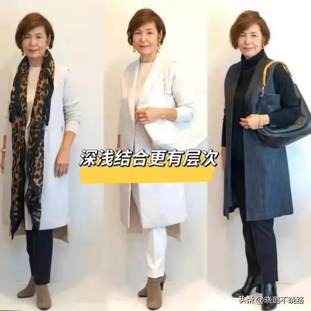 五十歲以上的女人如果想要自己的穿搭更有層次感,避免厚重與土氣,那麼一定要在配色上做文章,建議大家可以選擇深淺結合的方式,簡單的說就是上衣與下裝和鞋子之間的顏色要有明顯的深淺過度,比如卡其色的毛衣配米色的褲子以及白色的鞋子,從頭到腳顏色越來越淺,可以降低整體的量感,讓你的身形更加利落一些。記住,小個子的女人想要穿出高挑的感覺,那麼一定要將淺色放在鞋子上,擺脫厚重與沉悶感。