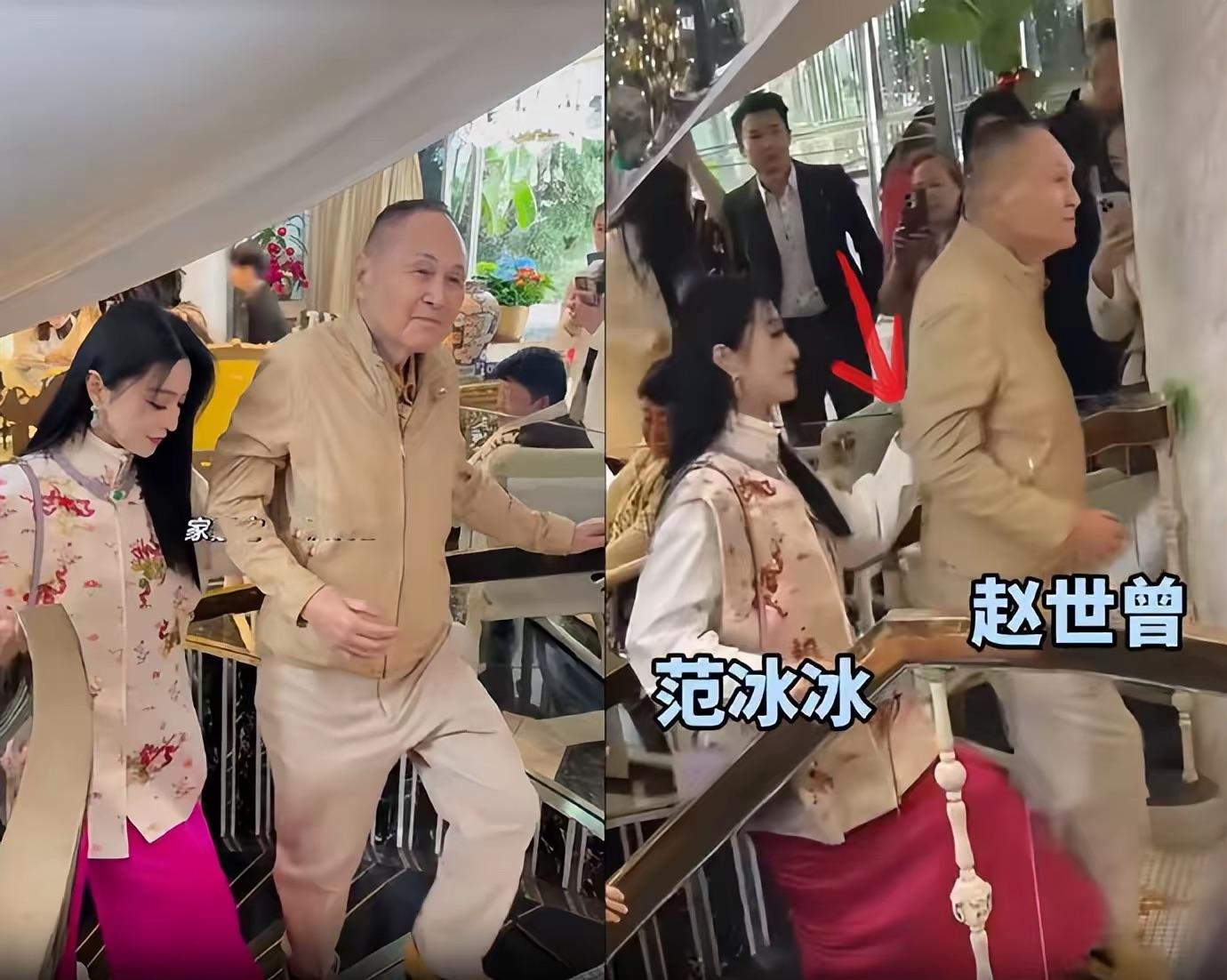 咱就看看這畫面吧,隔着屏幕都讓人覺得尷尬。范冰冰打扮華麗貴氣,88歲的趙世曾是“香港四大船王”之一的趙從衍的兒子。
