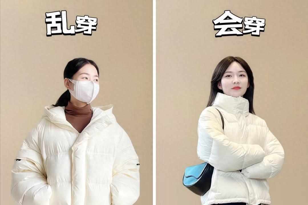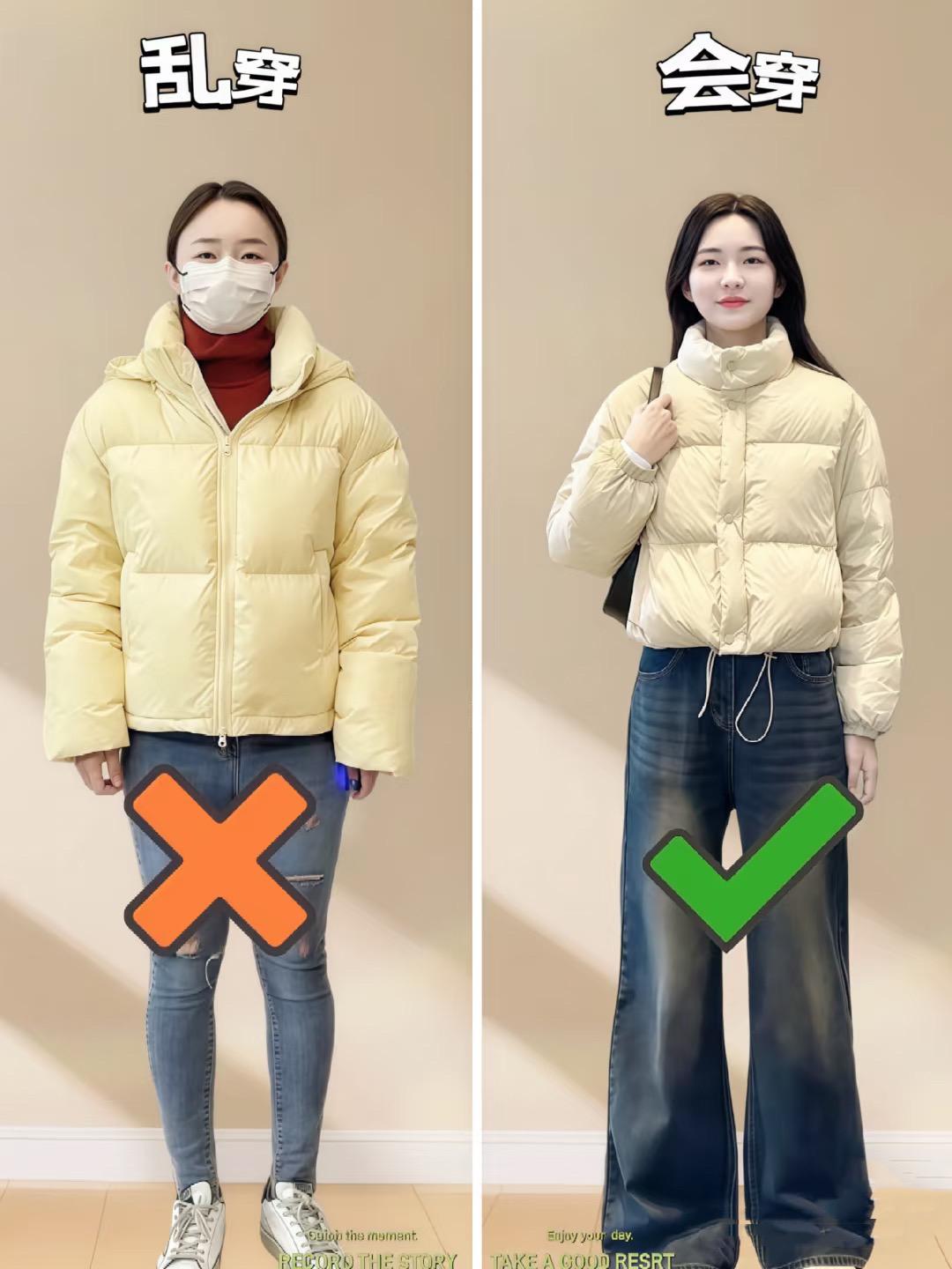短款的白色羽絨服,儘量不要配小黑褲。我們也發現,小黑褲漸漸退下歷史舞臺了,似乎沒有人願意穿了。