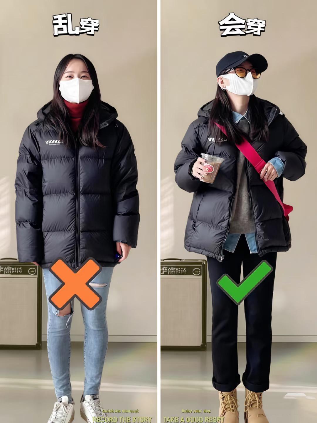 特別火的過腰款羽絨服,也是需要認真搭配。如果搭配不好,就很容易踩雷,配緊身牛仔褲特別容易顯得頭重腳輕。