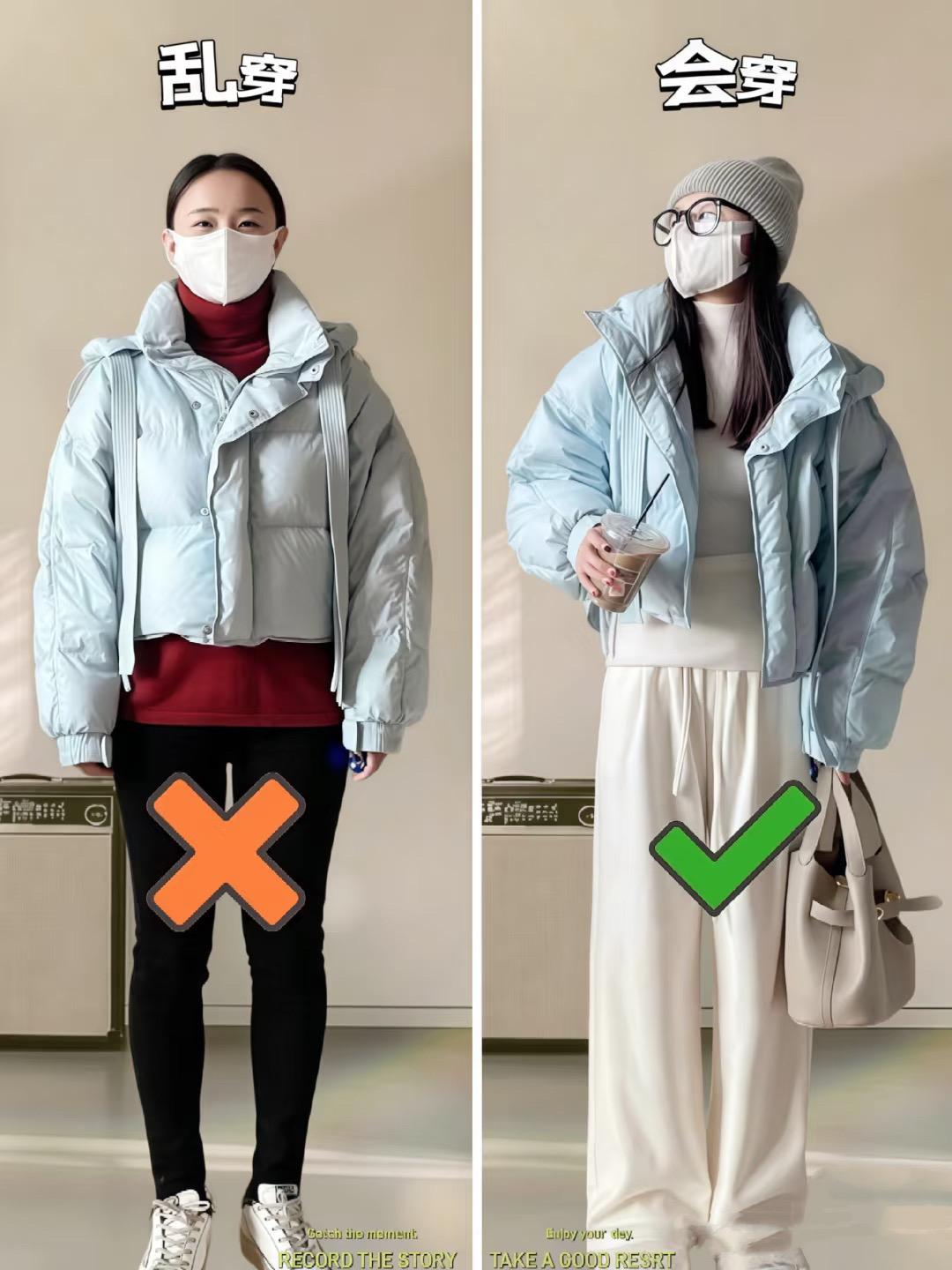 一件天藍色的羽絨服,看似清淺溫柔,但如果搭配不當、就很容易顯得土氣。胡亂穿衣、配厚毛衣、小黑褲,顯得身體又胖又土。