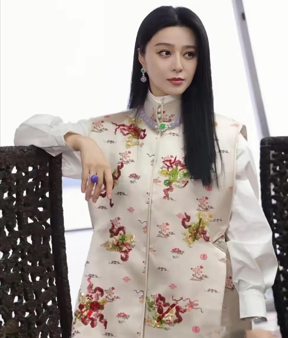 范冰冰穿着華麗,一身價值不菲的真絲套裝,雍容又貴氣。她皮膚很白、眼睛很大,一頭黑長直的長髮,女神範十足。