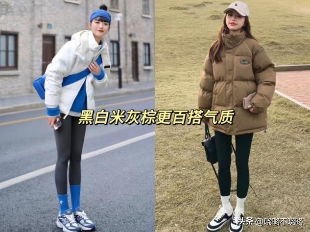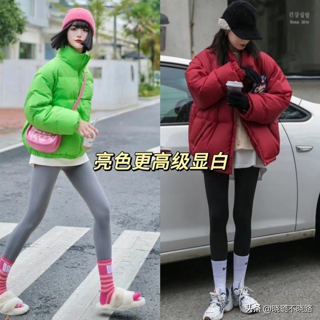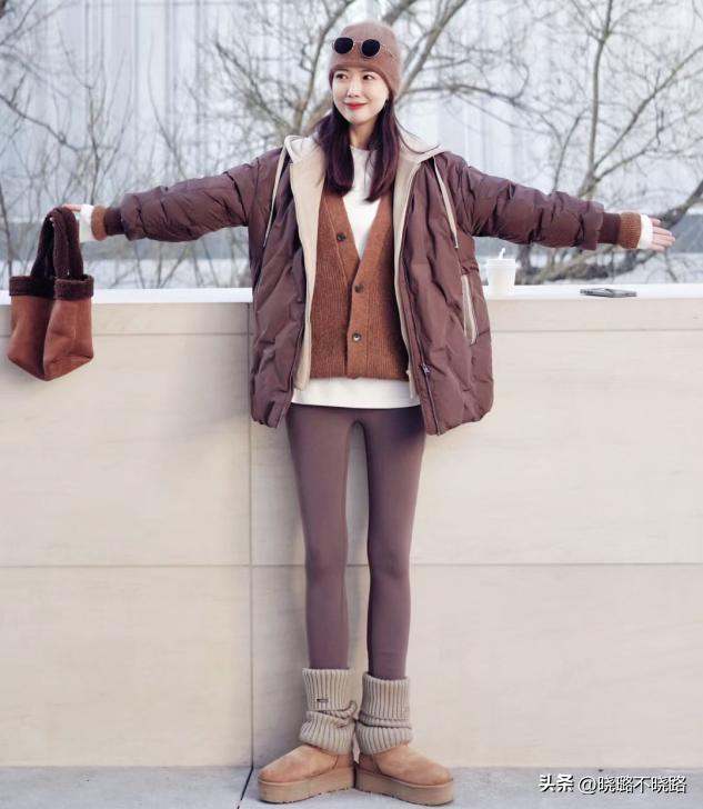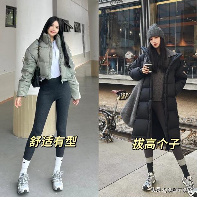 (1)上身羽絨服,下身瑜伽褲,平衡整體的量感